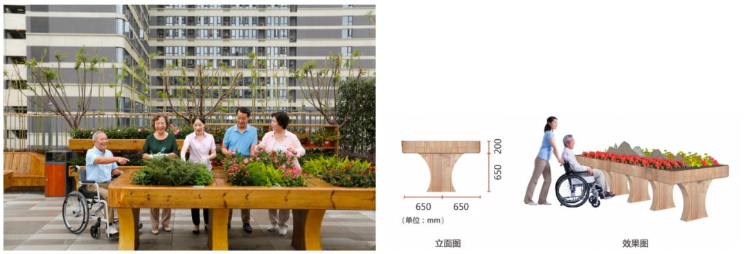 在重庆龙湖颐年公寓康复花园的设计中,为了保证坐轮椅的老人也能在花卉种植池上自如的操作,种植池底部距离地面0.65m,让轮椅老人双腿刚好放入种植池底部空间;为了让坐轮椅的老人同时在种植池两侧展开园艺活动,促进老年人的交流,设计团队特意加宽了种植池的宽度。