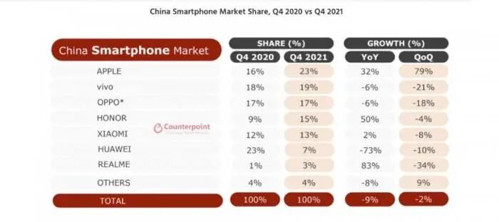 如果以手机品牌来看,苹果在中国已经很能打,据1月Canalys的数据,苹果在2021年第四季度的中国市场占有率,达到了其自2009年进入中国依赖的历史巅峰,占市场出货总量四分之一,高达25%。排名在其后的OPPO、荣耀与小米均为16%的市场份额。