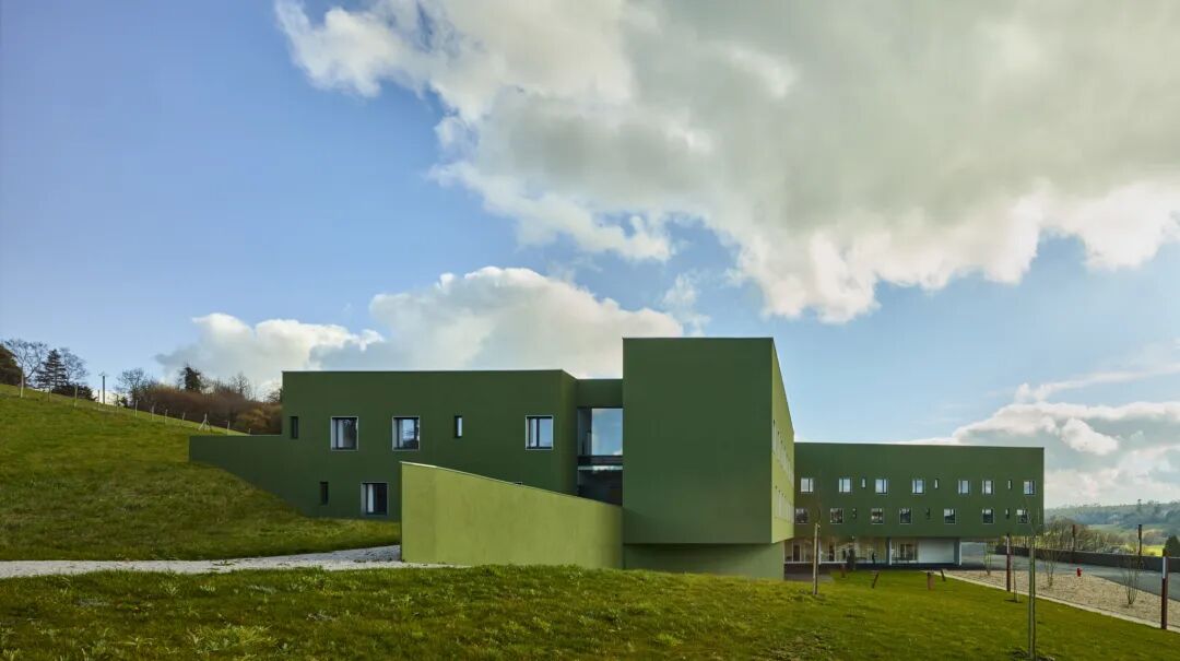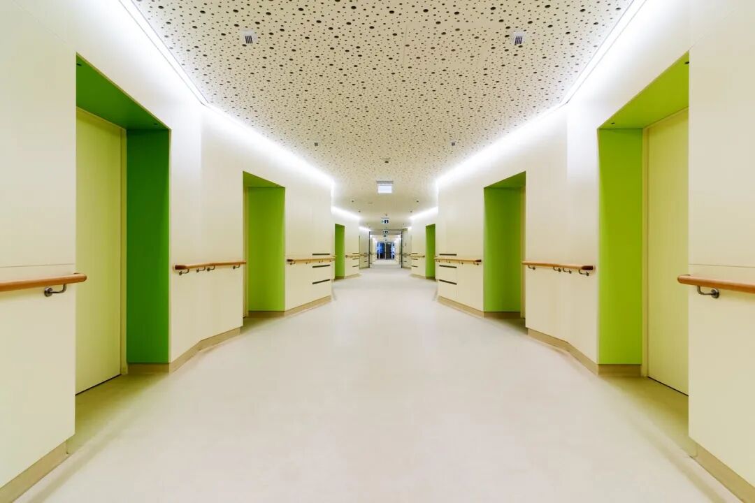 然而,还有一些其他的方法可以确保看护者的工作可以顺利完成,同时创造出活跃的动态空间。最简单的方法是使用颜色,法国奥尔贝克的受抚养人之家选择了非常规的颜色进行设计,内部走廊漆成鲜红色和清爽的白色,没有使用传统的医疗建筑配色,外部的绿色立面也营造出迷人的空间,将中心与周围的景观连接起来。