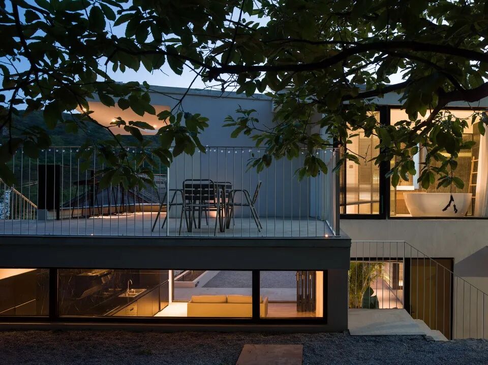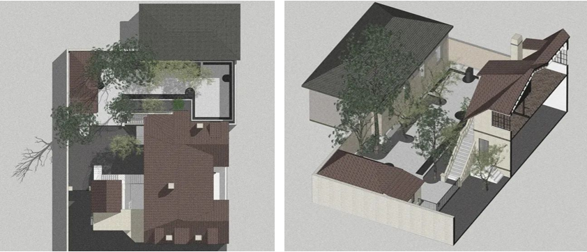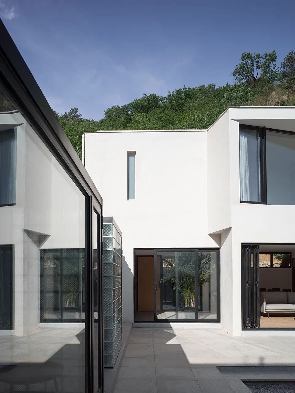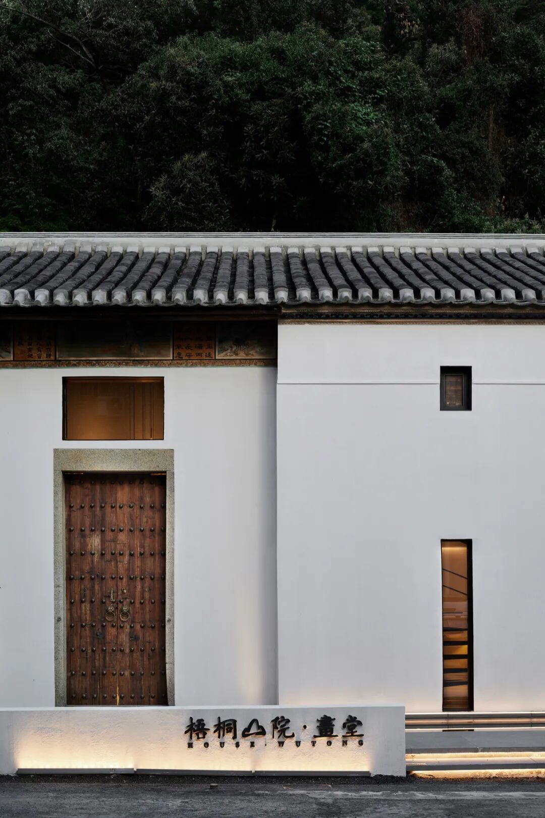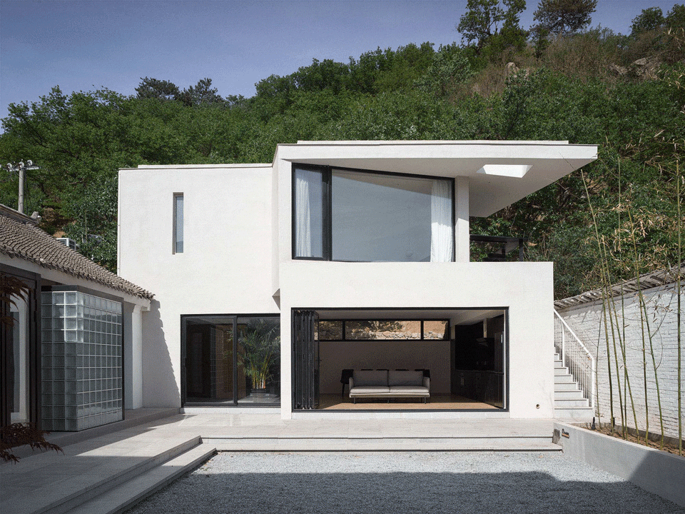 改造之前的小院虽在山脚但却并不紧挨着山,和山脱开一个开间的距离做出对山敬畏的姿态;于是我们便利用这个空间作为入口外院,从此院可以拾阶上到山腰一处可与小白楼首层客餐厅及二层露台对视的树荫平台。