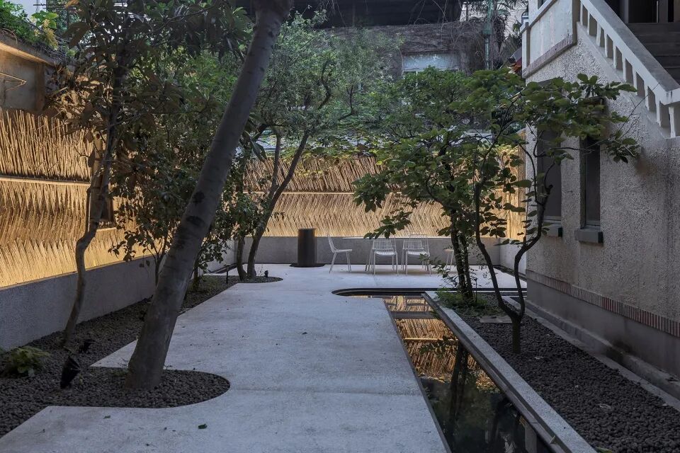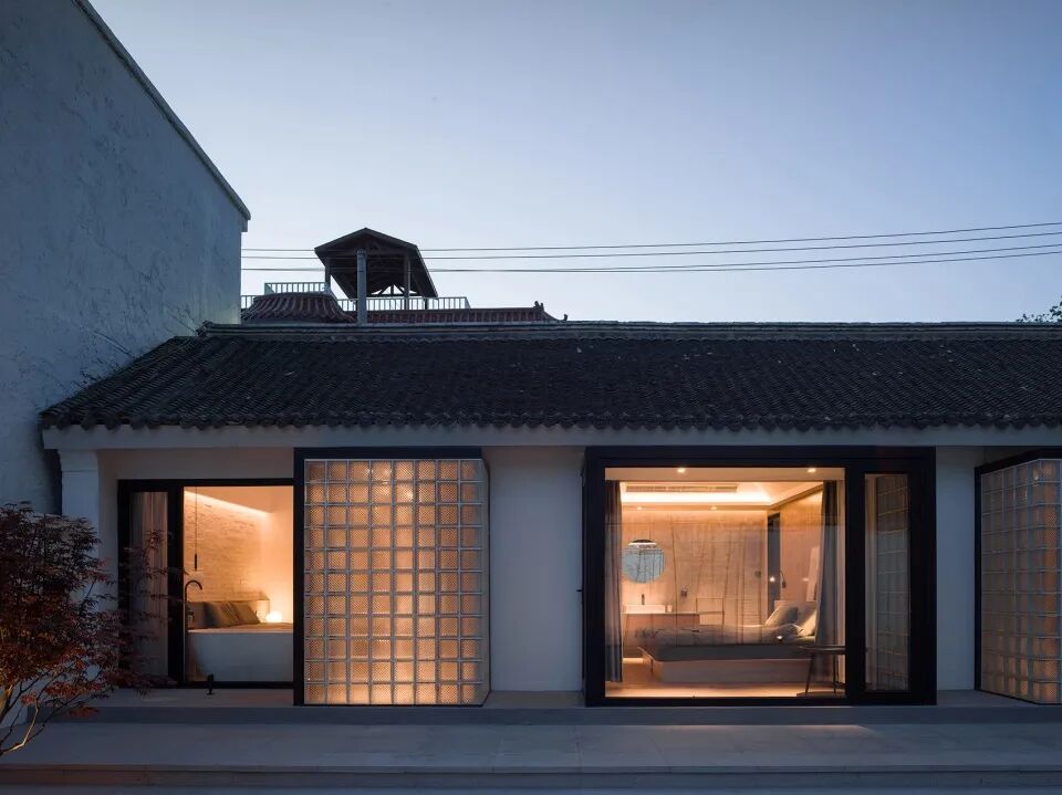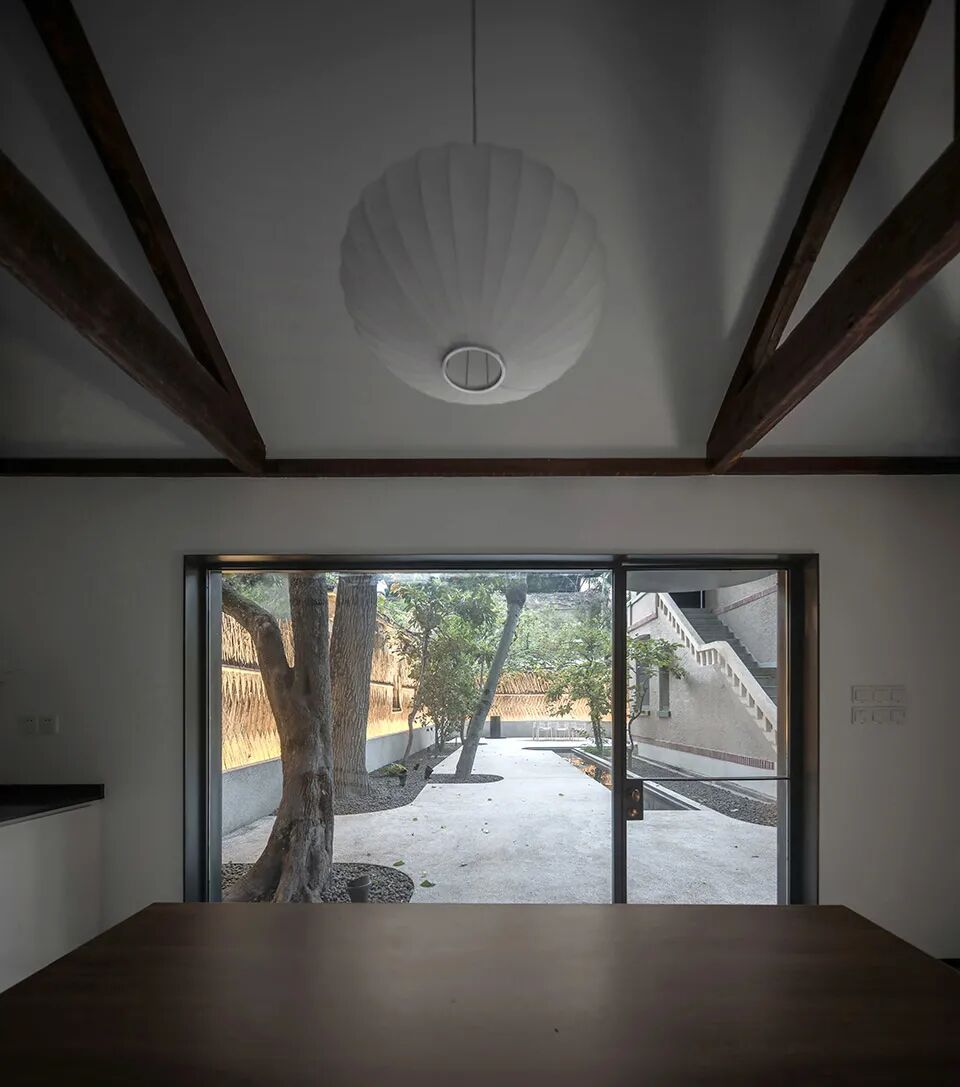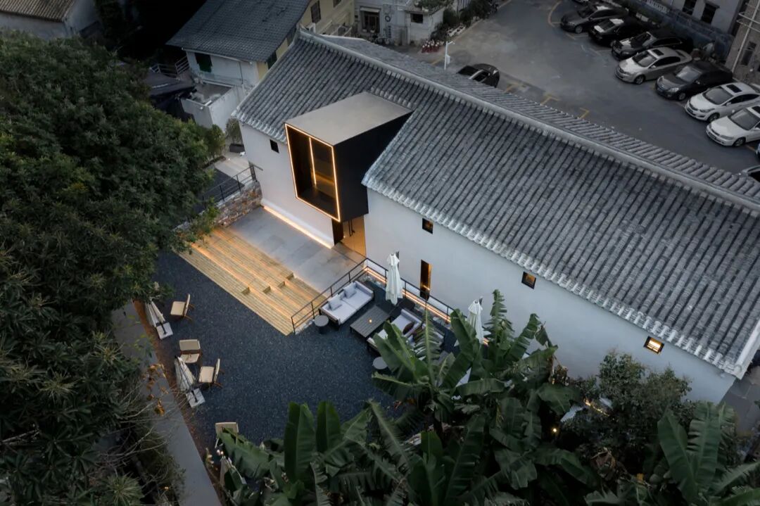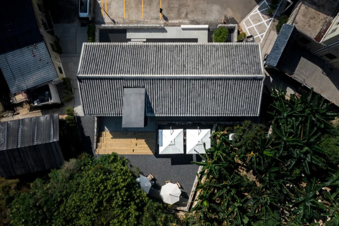 三合院中被房子围合出的四方院落的空间形态得到保留,成为项目的核心内院,是客餐厅延伸出来的、没顶的活动场所,是正房客房面向的、内聚的景观空间;基于此,设计上,客餐厅面向内院的界面可以完全打开;