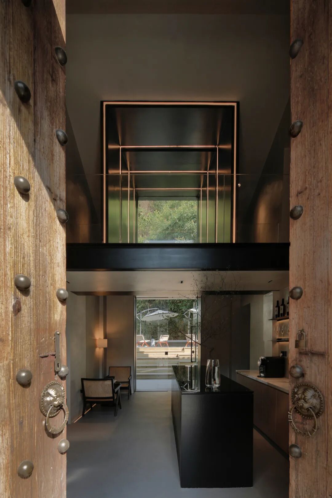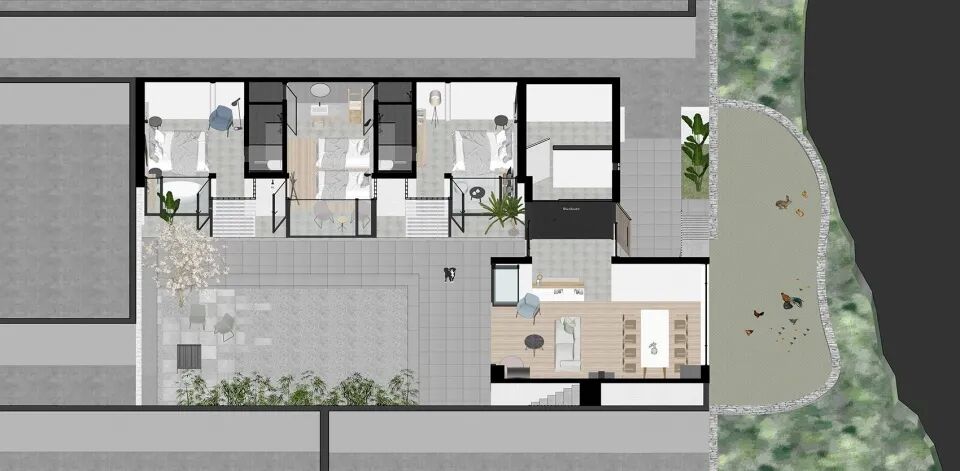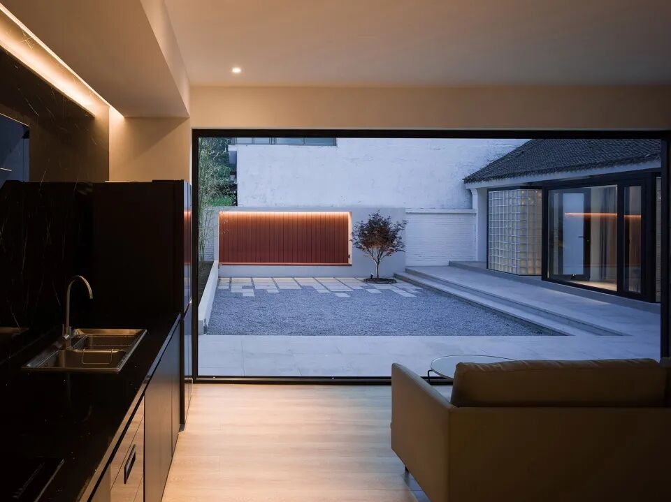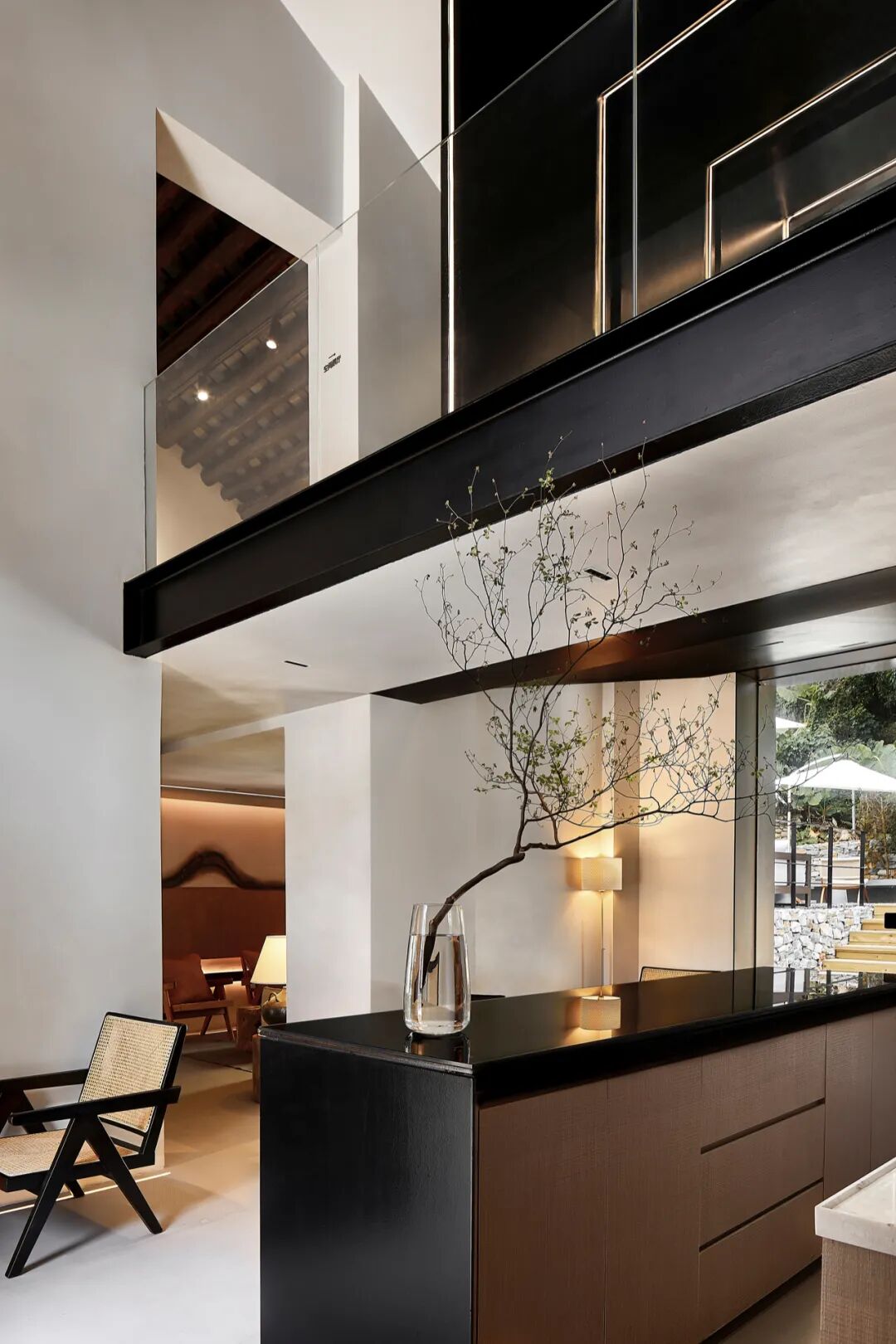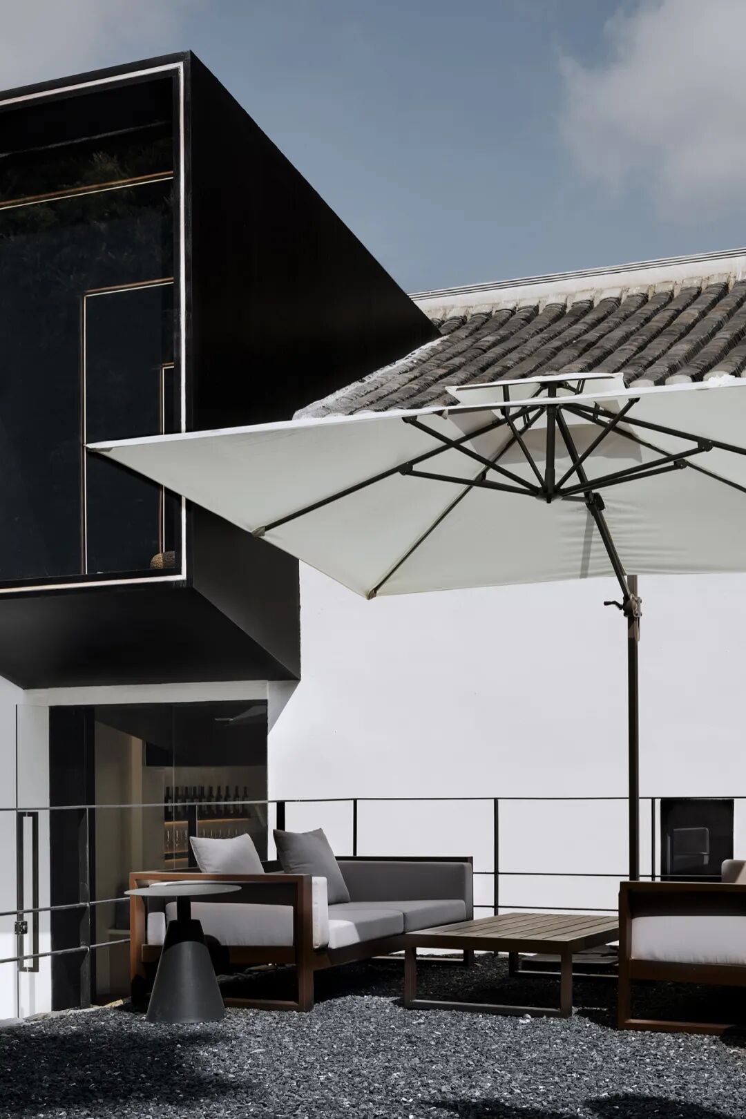 三合院中被房子围合出的四方院落的空间形态得到保留,成为项目的核心内院,是客餐厅延伸出来的、没顶的活动场所,是正房客房面向的、内聚的景观空间;基于此,设计上,客餐厅面向内院的界面可以完全打开;