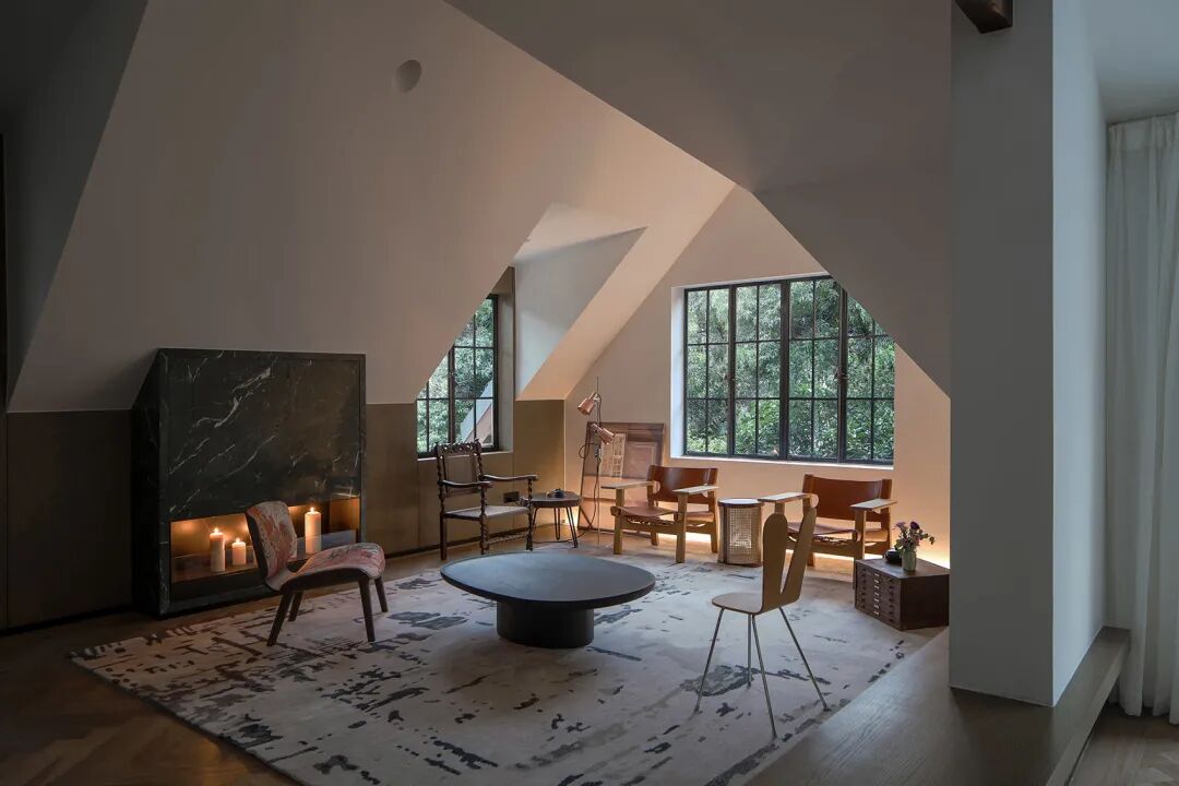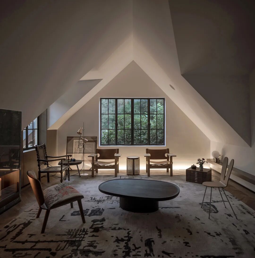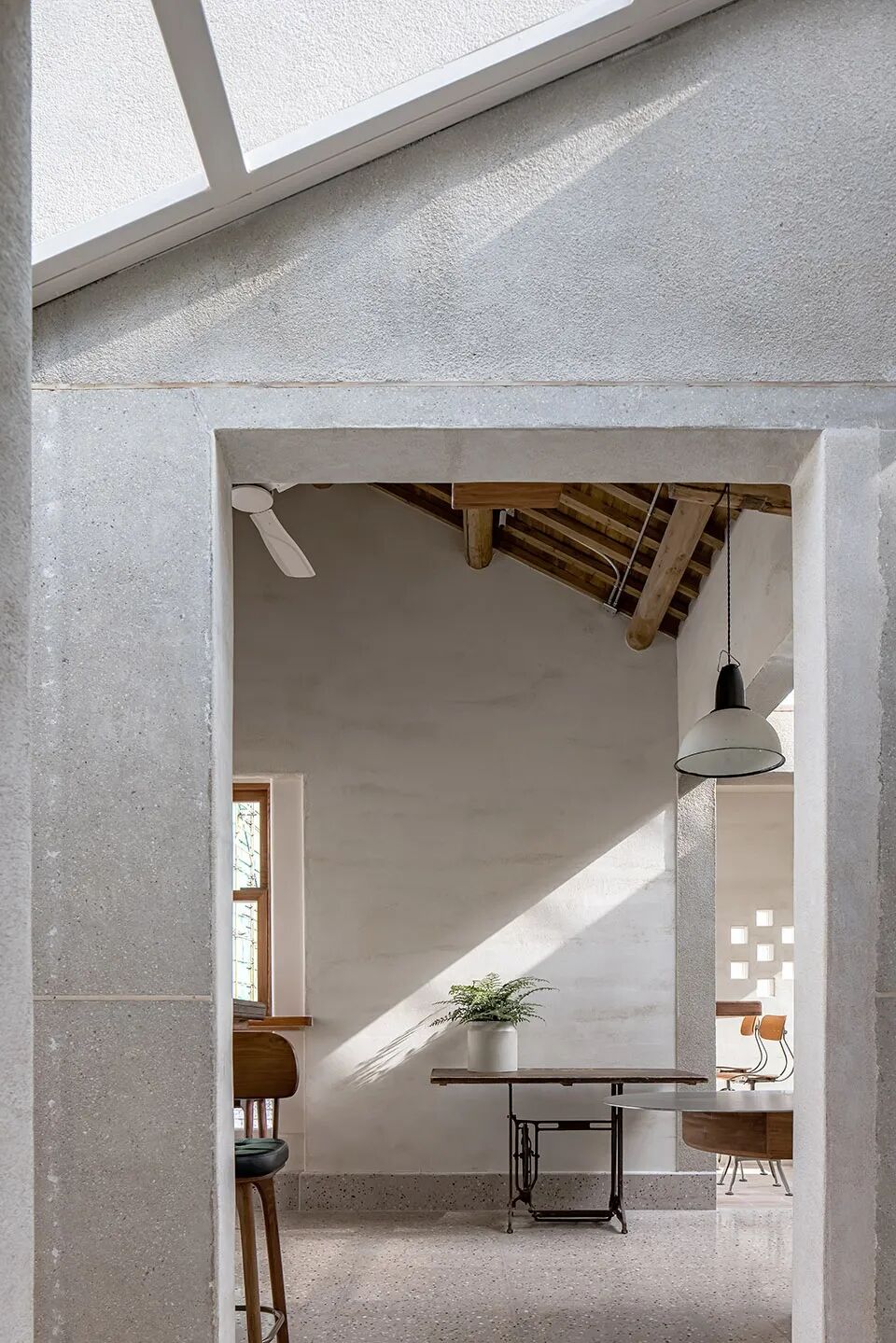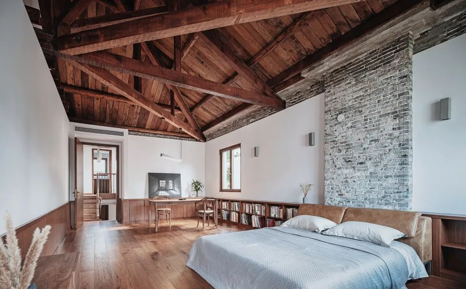 其中最为惊艳的是曾经被隐藏在顶层吊顶之下的木屋架,拆除之后让整个顶层空间变得更为宽阔,犹如一把三叉戟,以岁月的脊梁支撑着这个被续写新生的老房。
