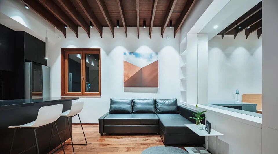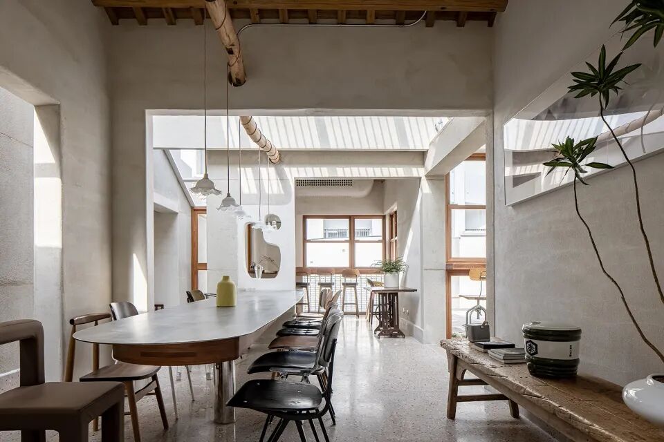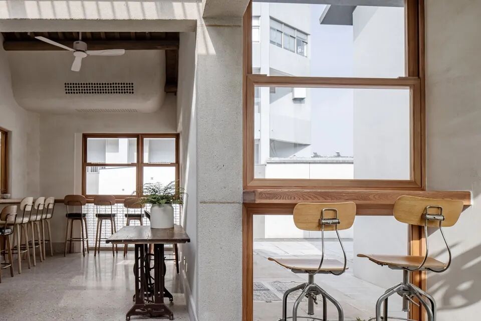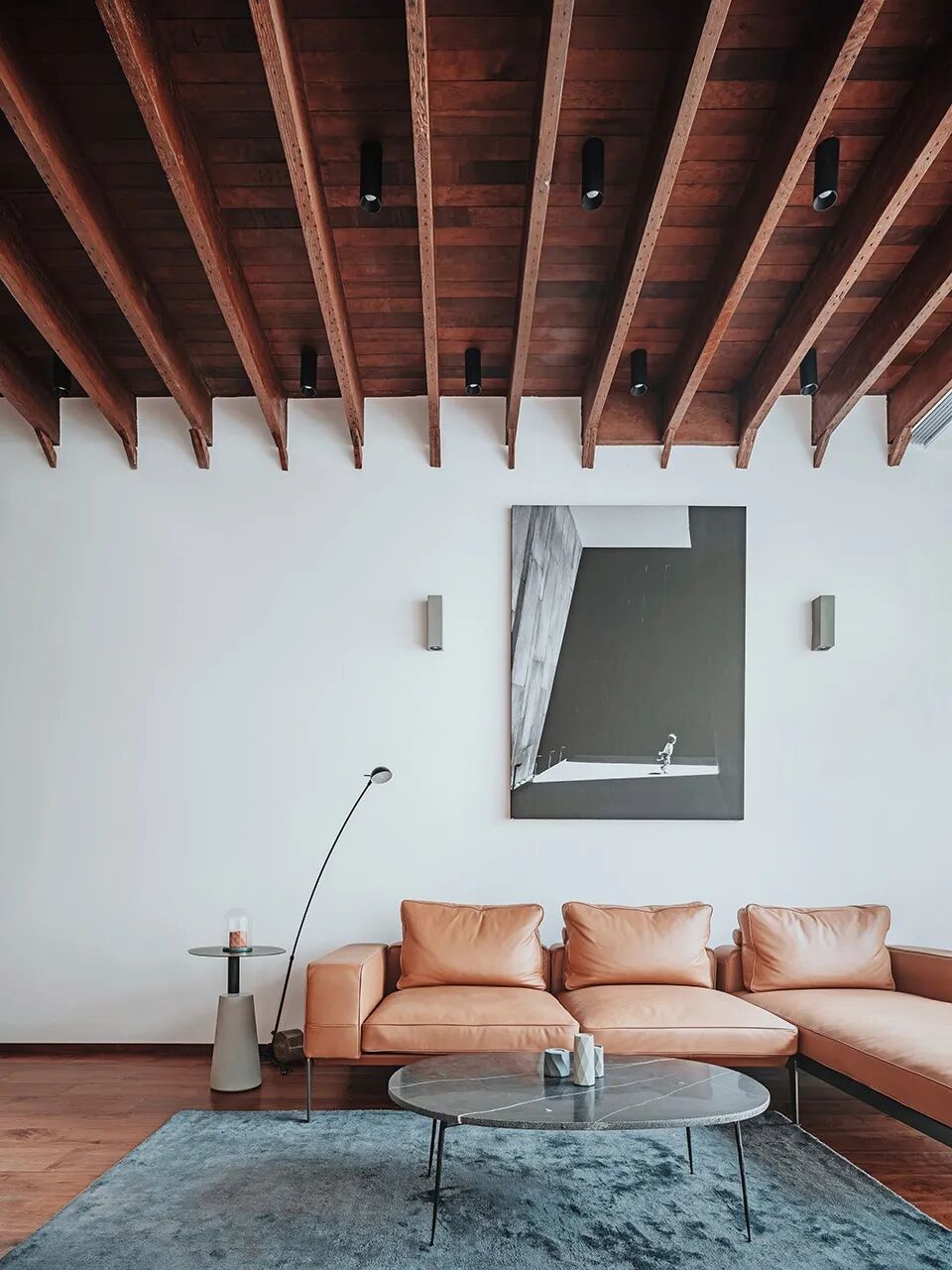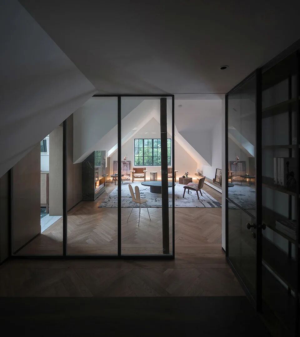 其中最为惊艳的是曾经被隐藏在顶层吊顶之下的木屋架,拆除之后让整个顶层空间变得更为宽阔,犹如一把三叉戟,以岁月的脊梁支撑着这个被续写新生的老房。