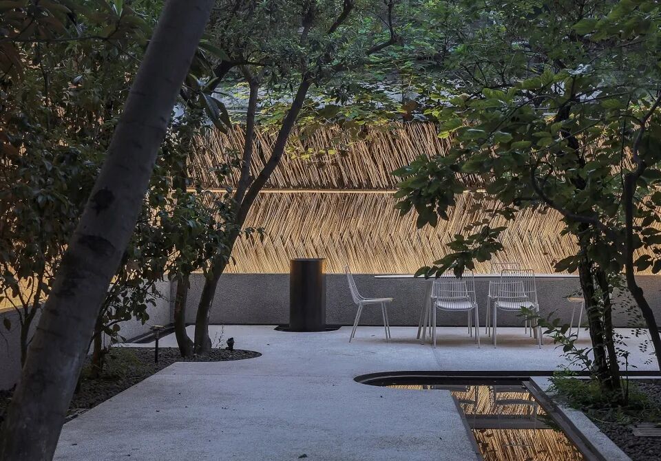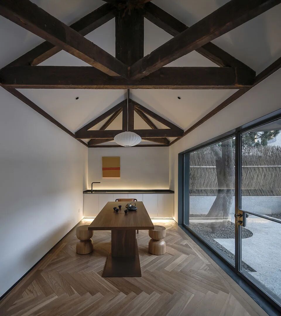 吊顶拆除,尖顶打开,并对一些已经腐烂的木结构进行加固更新,将两组对称的屋架木樑裸露,空间感得到有效提升。茶室内设置了水吧台,柜体上下暗藏的灯带使室内灯光延续了庭院灯光的静谧感。