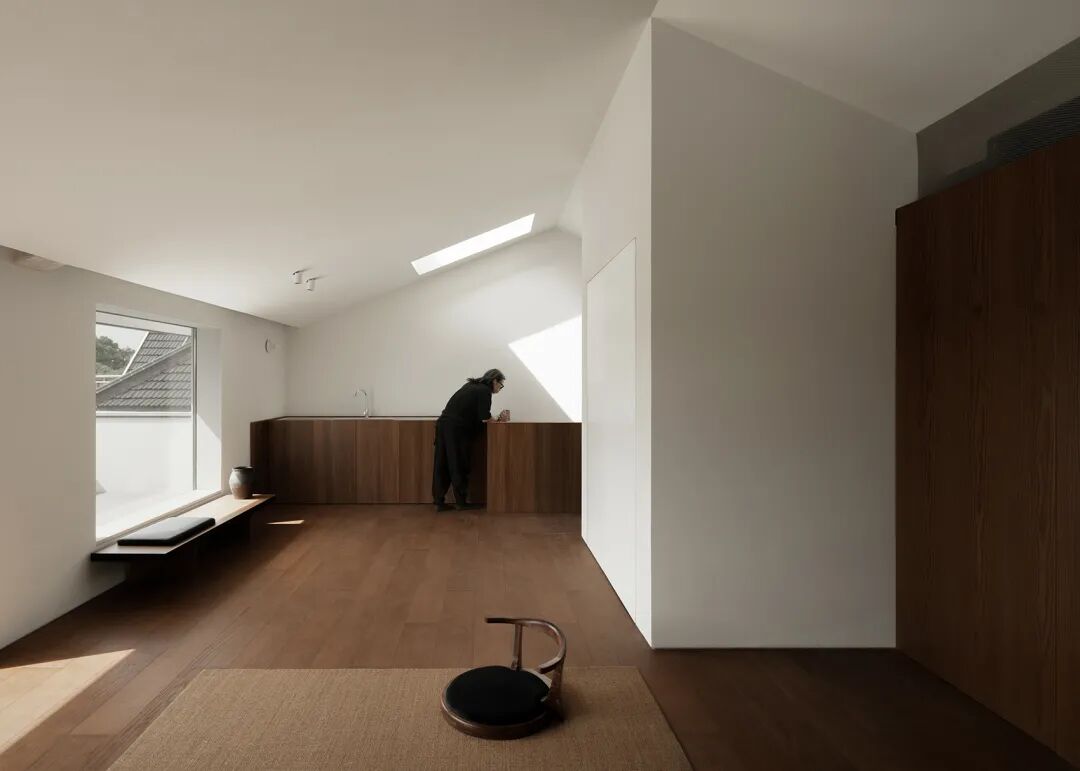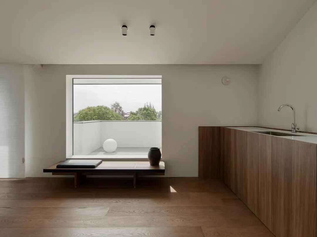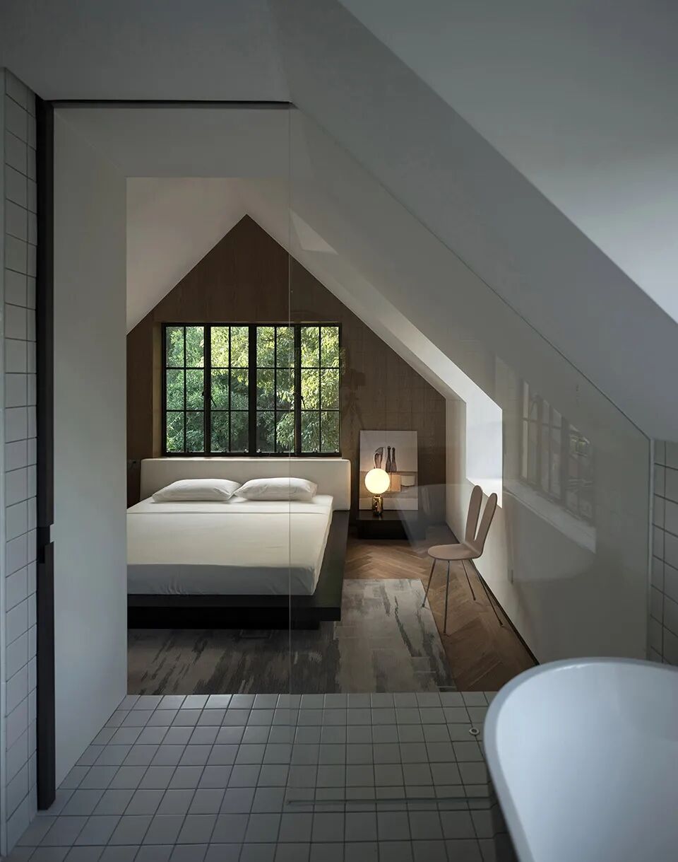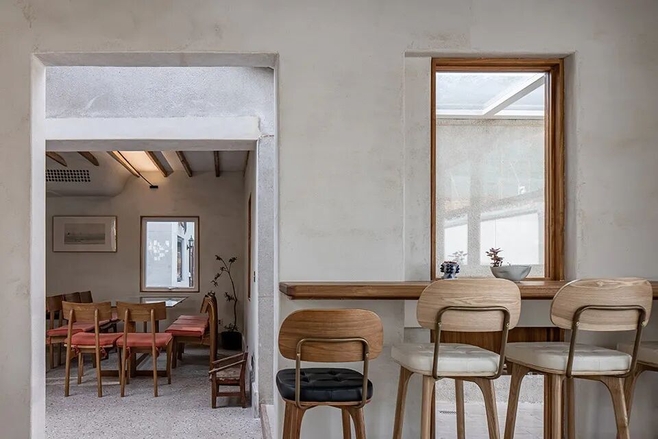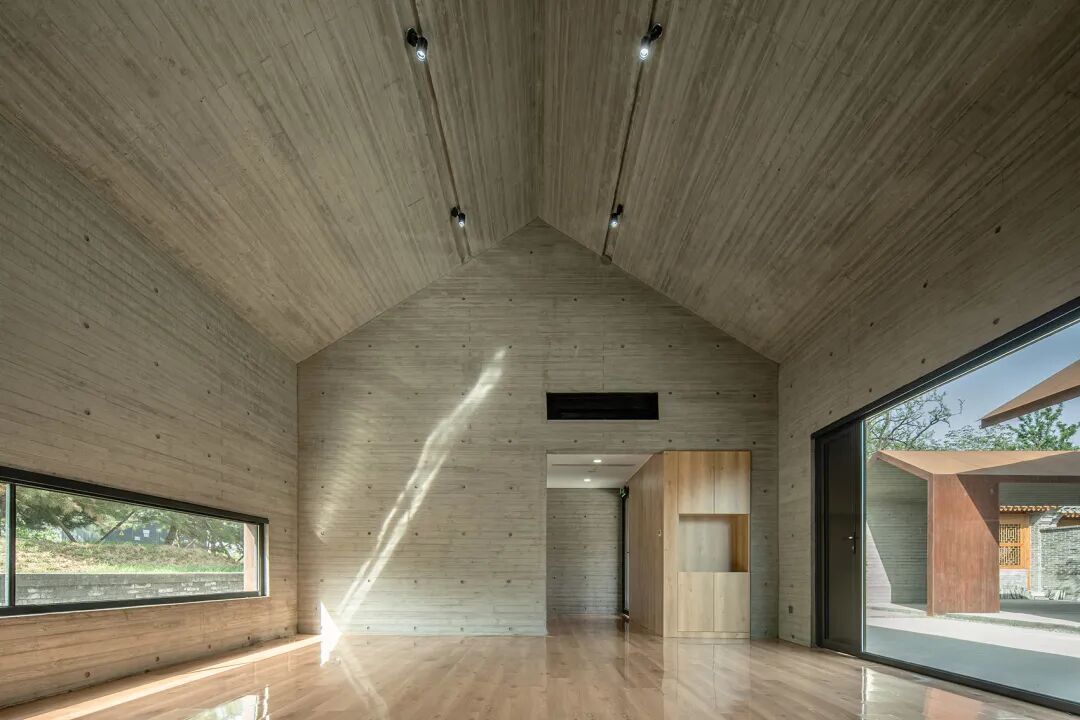 房屋内保留原建筑标志性的瓦质坡屋顶,墙面做简洁化处理,保留石制门槛。被改动过的小窗回归原来的位置,并用钢板收边,以突显当下设计的介入。