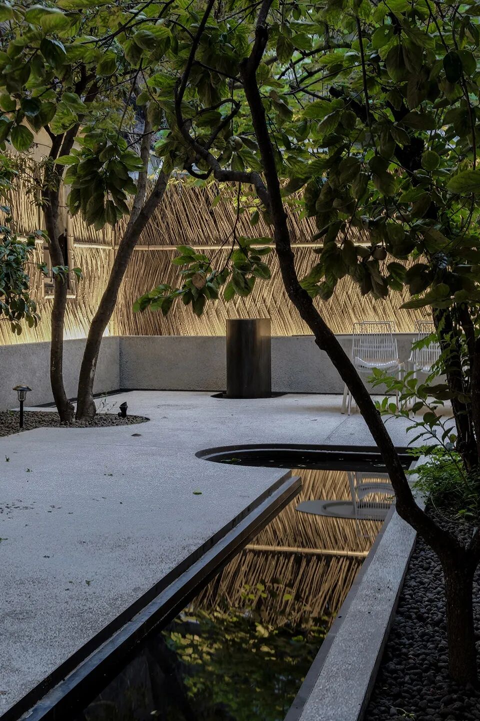 以现代的空间力量及仪式感形成空间结构的特色,玻璃与砖墙,现代与传统,叠造共生,融入环境。前广场设立矮的石挡墙界定前场空间,设立水庭柔化了建筑与环境的关系,为建筑增加了光影和神秘感。