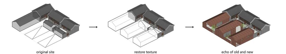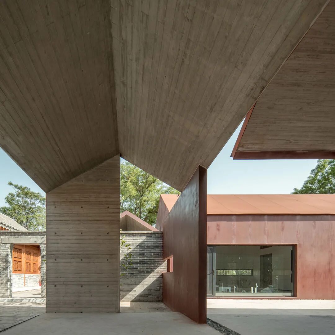民国小院位于原张辛庄村西北侧,为一座不完整的两进院落,留有民国时期民居三间及院门一座。残缺的院落和拆掉一半的相邻红砖房,让我们知道城市化进程下轰鸣作响的推土机在这片土地上曾呼啸而过;灰砖、红砖、彩钢板等多种建筑材料的混合,也让我们知道这个院子随着时间也在不断地野蛮生长。 ▲院落现状 ▲建筑生成逻辑 中国传统建筑具有一种“真实表达”的特性,木、砖、瓦等通过材料自身特性构成建筑结构、墙体及屋顶等组成要素。设计团队希望,新建部分能在建筑形体、结构及材料等方面与保留建筑形成一种“新与旧”的对话——建筑形体方面,在延续原坡屋顶形式的同时尽可能简化建筑形象,使之更为简单纯粹;建筑结构方面,通过采用钢筋混凝土剪力墙的结构形式,将建筑结构构件与墙顶的围护构件融为一体;建筑材料方面,选取混凝土和锈蚀钢板这两种“现代”建筑材料,而这两种材料又同时分别代表建筑的“内”与“外”。 几十年前,她是通州张辛庄村一组普通的村民自宅,精细的砖雕及窗棂都投射出这家人的富足与殷实;几十年后,她是城市绿心森林公园内一座供游人休憩的咖啡厅茶室,以一种新的姿态和方式展现在世人面前。