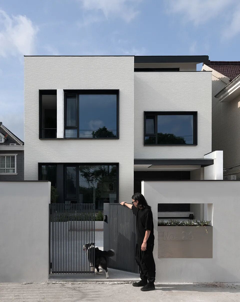 设计师重新设计了庭院入口,在邻居的前院和侧院的分界线处立起一道铸铁隔珊矮墙,使进入庭院得入口充满仪式感。入口处原庭院内的辅助用房更换了小窗,暮色降临时,窗内暖黄色灯光氤氲,营造一种回家的感觉。
