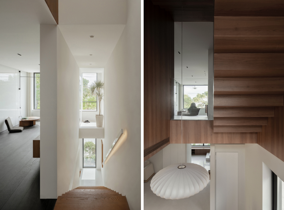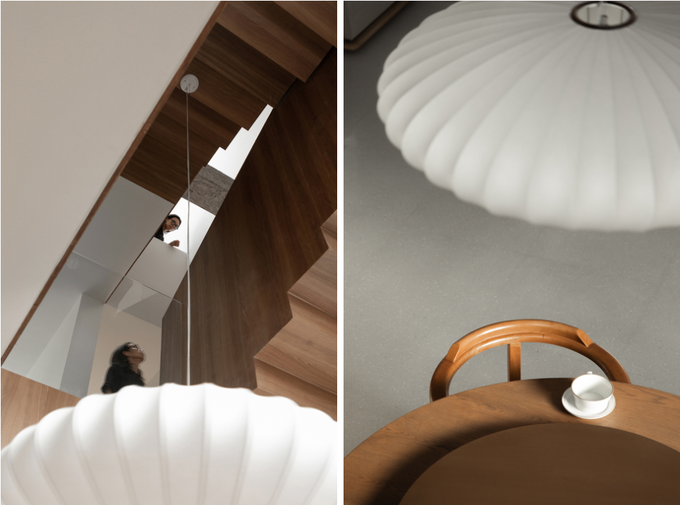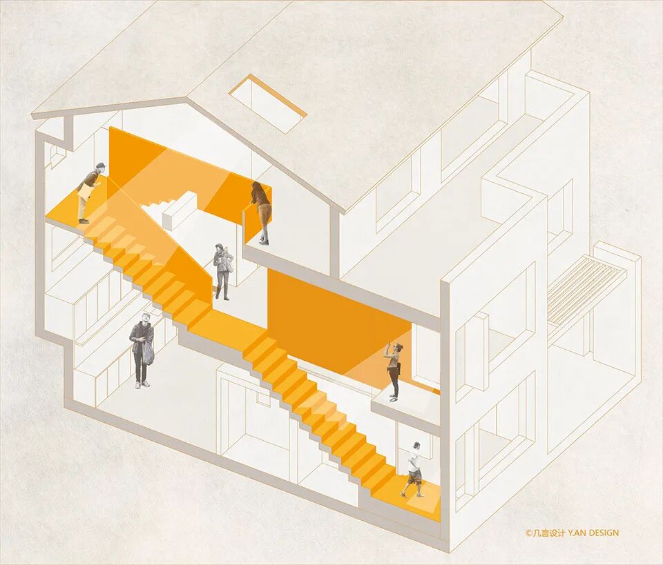 楼梯不再单一的交通属性,这是一个具有如同街巷尺度的场所,“巷子”将多个楼层进行串联,满足功能性的同时承载着人的关联,实现公共性,交流性,自然性的最大化。这是个小家的精神内核,我们称它井巷子。