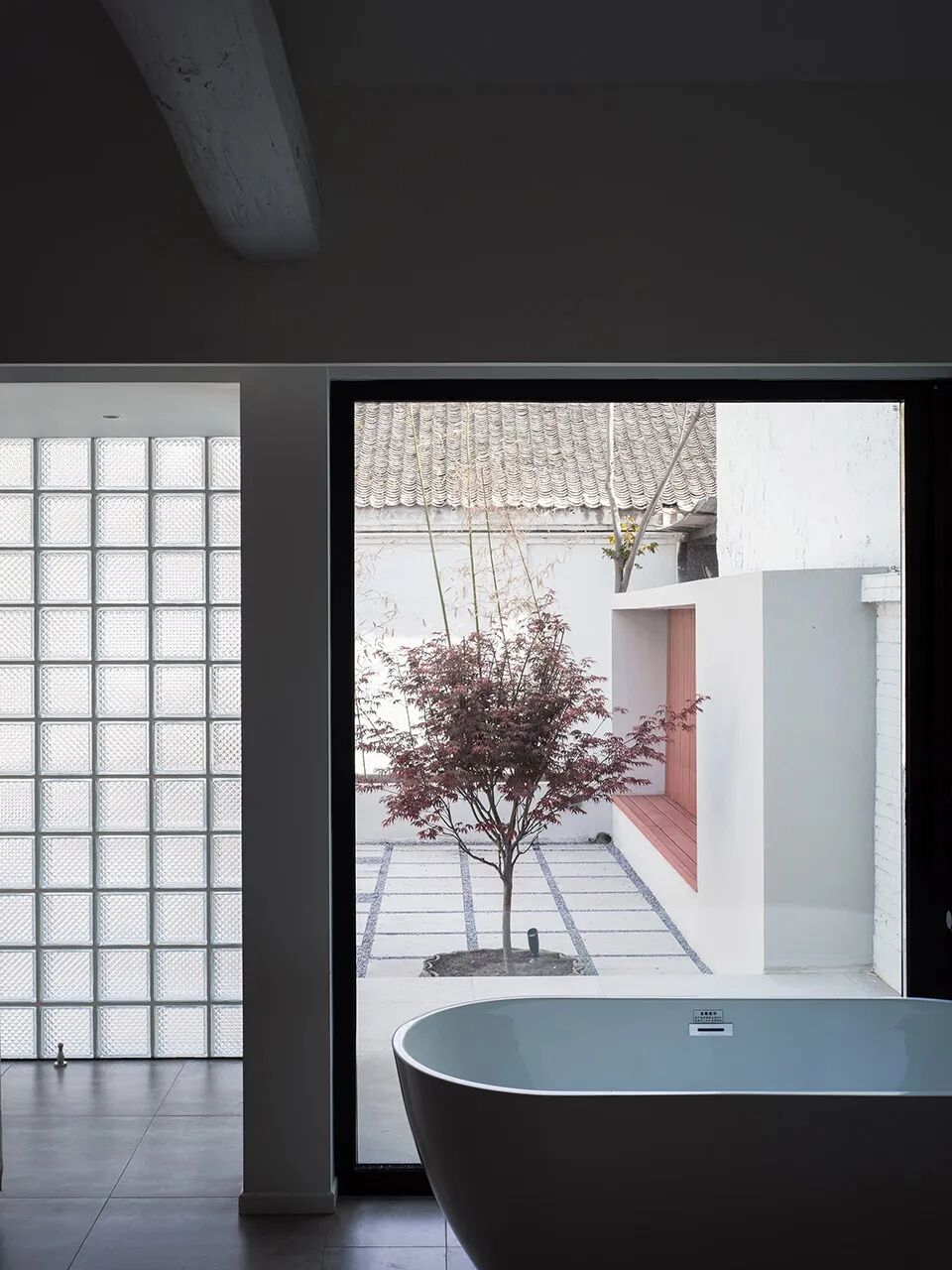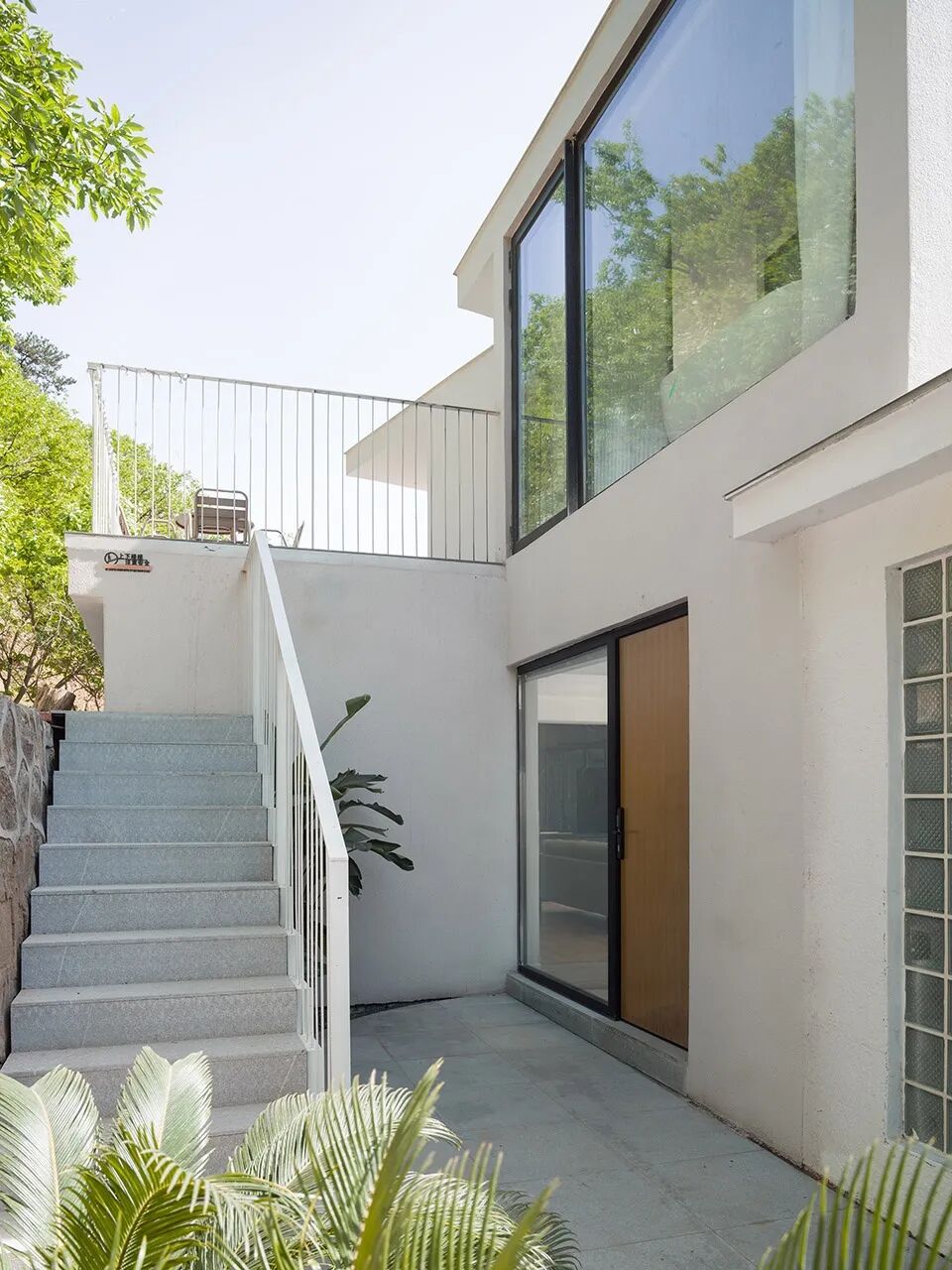 正房的三间客房面向内院的界面由砖墙、玻璃砖墙、落地玻璃窗组成,在透明性上形成三种不同层级,回应室内功能;内院角落里还有一部室外楼梯,通往小白楼二层,经过观景露台可达二层客房。