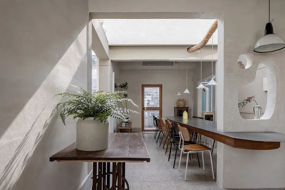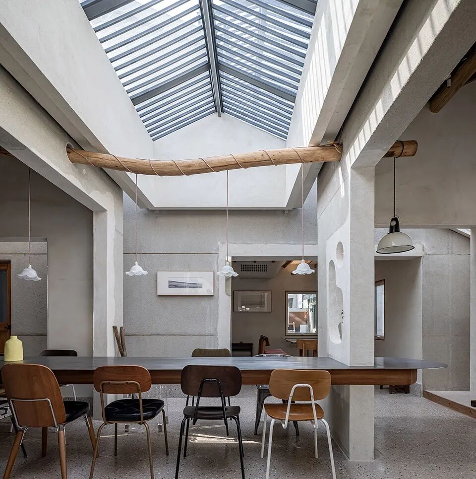 初到庭院,绿意葱葱,香樟树、柿子树、枇杷树还有叫不上名字的树木,树干和围墙被野生的藤蔓缠绕,构成了丰富的自然景观,高耸的树冠把繁茂的枝叶送到了二楼窗前,使整个二楼空间仿佛置身于空中花园。