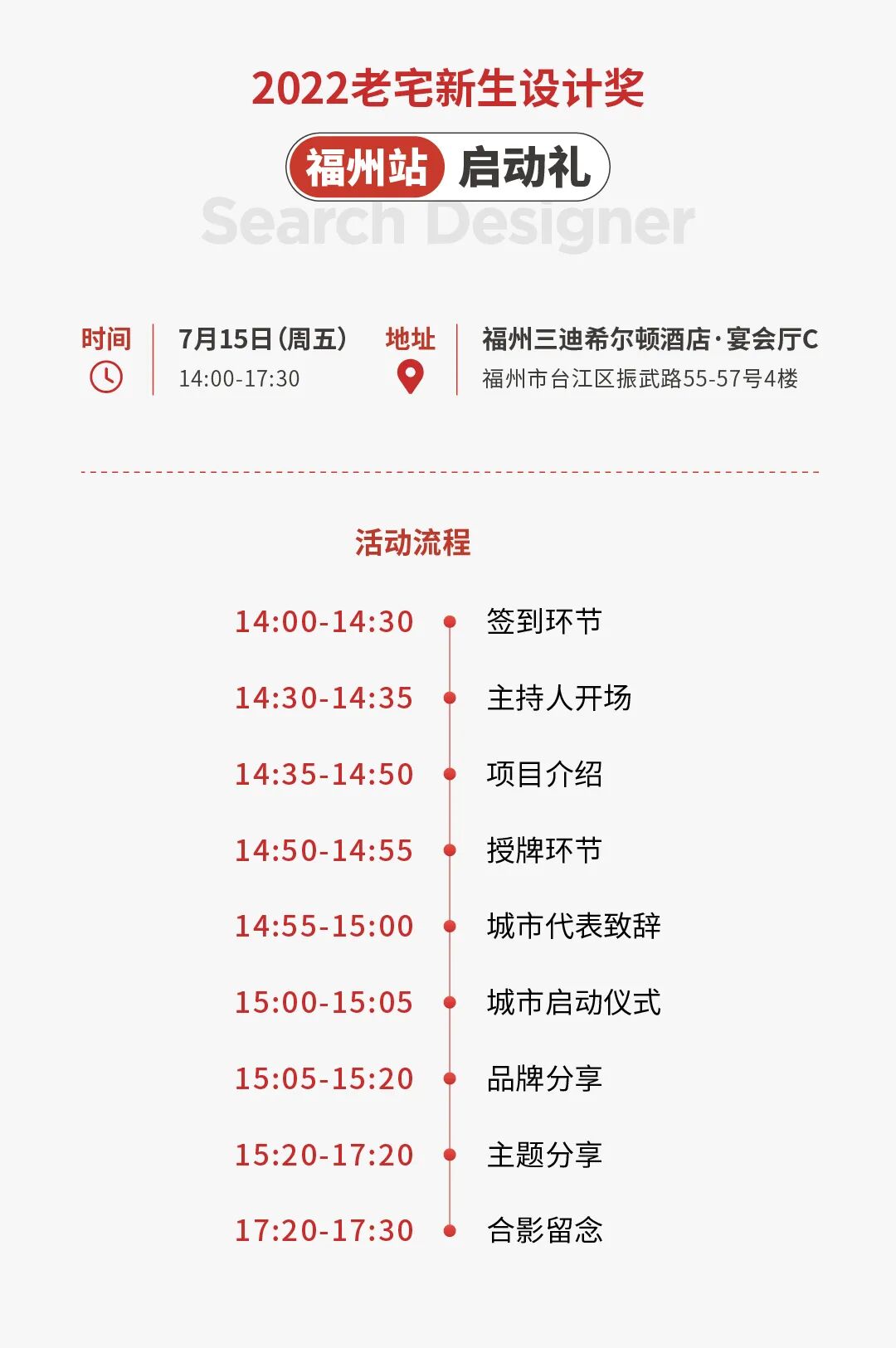 2022年7月15日,设计纪元、广州设计周携手齐心设将在福州三迪希尔顿酒店开启2022老宅新生(福州)站启动礼,本次活动由立邦品牌全程支持。届时特别邀请四位设计大师分别从不同的专业角度解读设计,期待你们的参与!