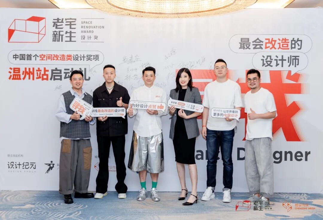 随后,设计纪元创始人 董嘉菲、十方圆国际设计创始人/设计总监 赖建安、二间半设计事务所设计总监/创始人 陈滨斌、温州锵设计创始人/设计总监 王锵力、立邦中国/装饰涂料事业部/江南公司新业务销售部总经理 项雁留、以及橙设传媒首席运营官 任丹一同上台,在倒计时声中,共同启动「老宅新生」设计奖温州站。