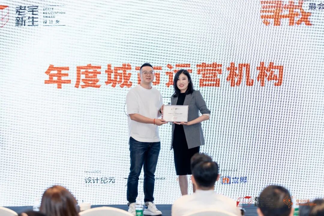 设计纪元创始人董嘉菲(左)为橙设传媒首席运营官任丹(右)颁发「老宅新生」2022年度城市运营机构牌匾,温州橙设传媒为温州地区官方授权指定唯一机构。