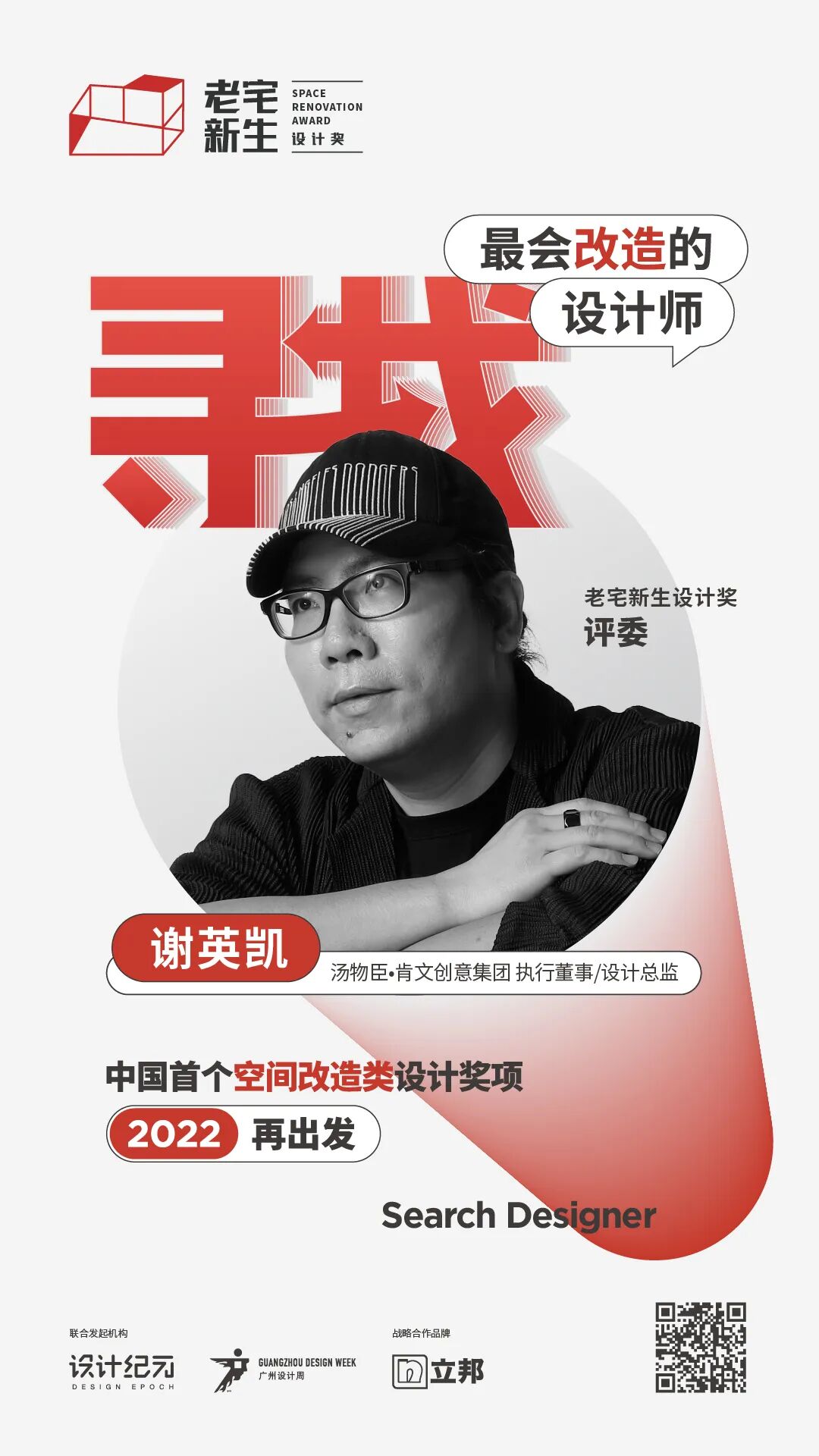 谢英凯,汤物臣·肯文创意集团执行董事、设计总监。法国国立公益学院(CNAM)工程与设计项目管理硕士、中国建筑学会室内设计分会理事会副理事长、中国建筑学会专家库专家、广州美术学院建筑艺术设计学院客座教授、「七+5」公益设计组织联合创办人、广东省陈设艺术协会设计师分会会长。