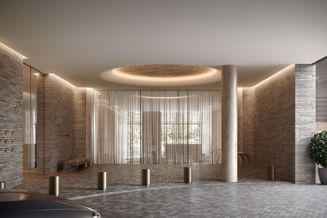 车库入口与大堂相邻,墙面在老建筑的基础上做了现代化翻新处理,灰棕色的条形瓷砖从立面延伸进室内,延续了空间的视觉效果。