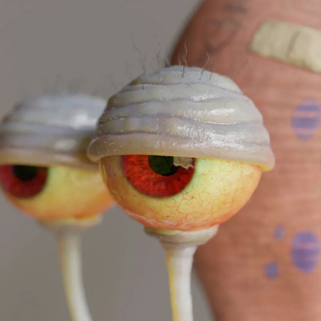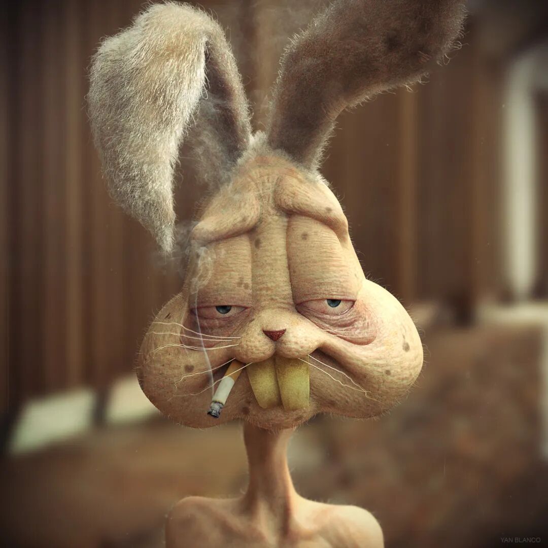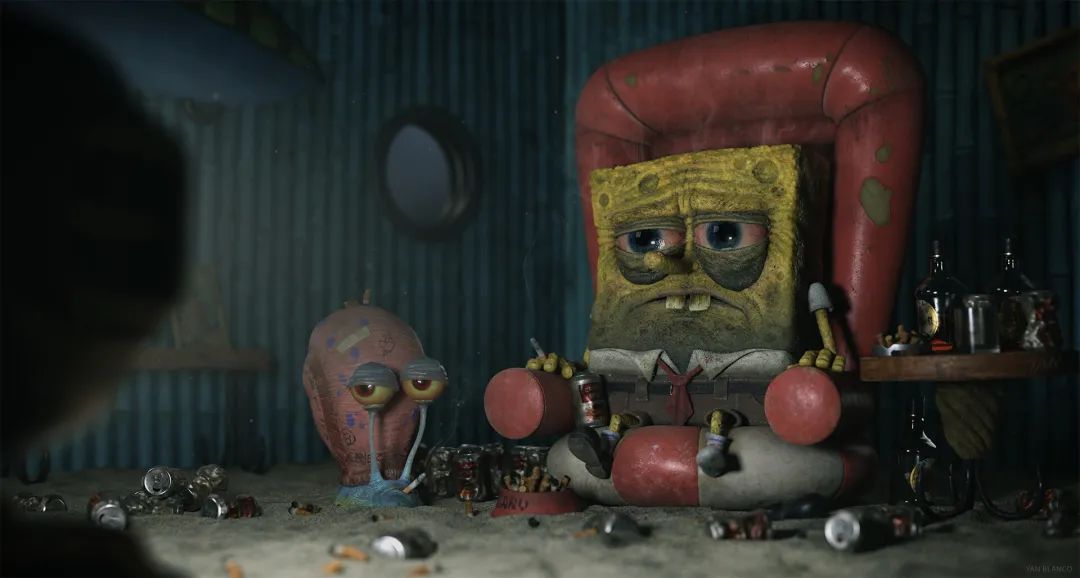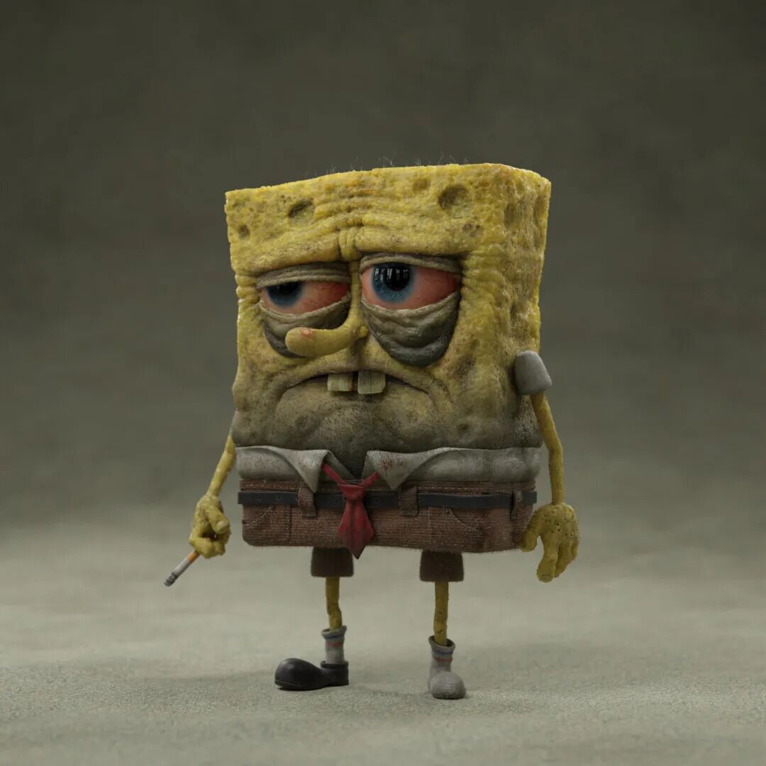 但无论是小猪佩奇的眼袋,还是海绵宝宝的皮肤颗粒质感与毛发,Yan Blanco对于细节的刻画都真实到让人感觉有些不适,写实恐怖却十分具有个人风格。