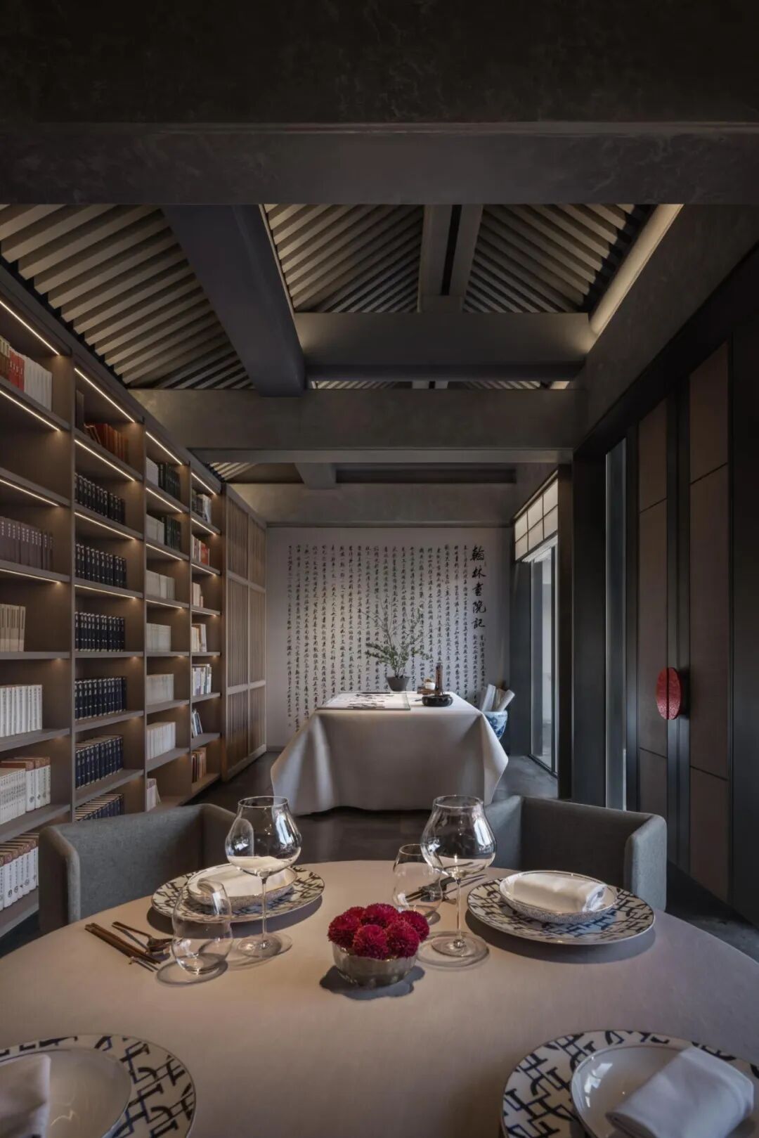 夜幕四合之际,窗外的疏木浮影携重叠游廊入画而来,厅内用餐之人也仿若弋于神秘而幽暗的中国画中。