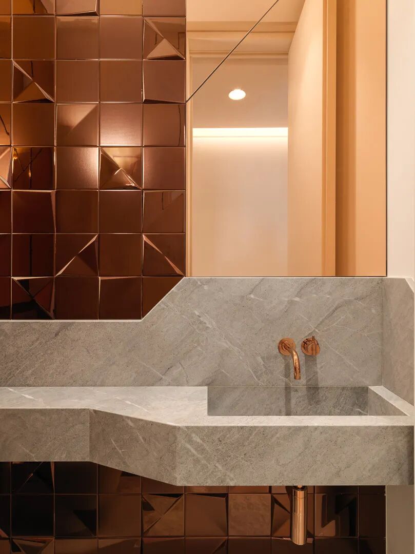「fusing French savoir- faire with a contemporary edge. Inspired by the geometric forms and bold colours of the Memphis movement, mixing graphics, form and materials to create architectural scenography.」