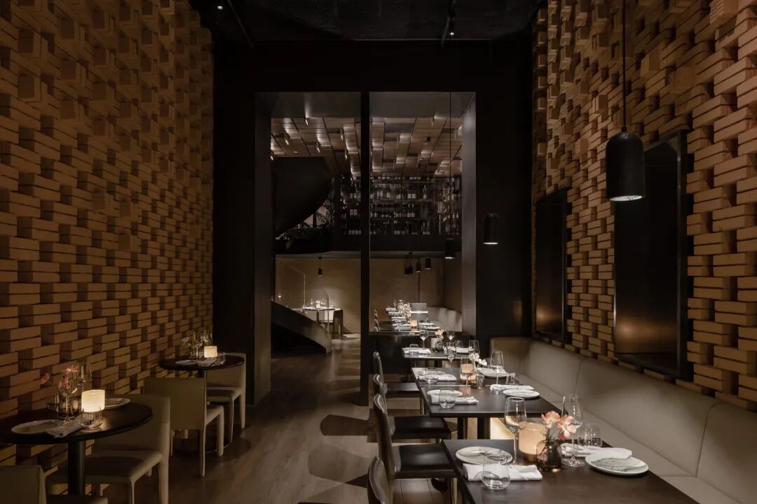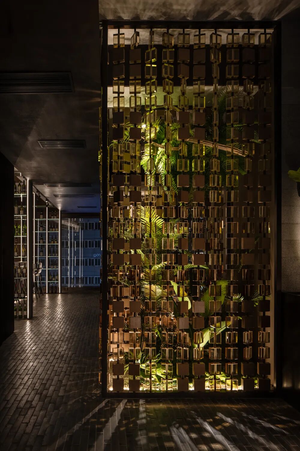 位于吧台右侧的DJ台,以垂立式的渐变色棕色玻璃砖,辅以穿插由四小块实木方砖排列成一个较大的方形为组合三合而成。而吧台左侧由双边木门柱划分独立的海鲜吧,其背墙亦以玻璃砖和实木砖组合彼此呼应。