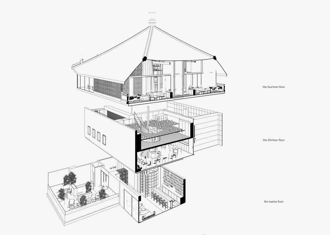 Le Coq位于西安凯曼酒店顶楼12层至14层,共三层。酒店以典型的历史方形城楼以及四角攒顶为建筑本体。RooMoo透过对古建筑的想象,转化了对“建筑轮廓”、“材料使用”、“图形结构“及“颜色表现”的运用,提取元素至三层环境设计之中。并且,因应Le Coq需求,针对每一层空间设计及功能,提供顾客完整而特别的VIP体验。所以,依序垂直向上将三楼层划分为:咖啡区、用餐区及酒吧。