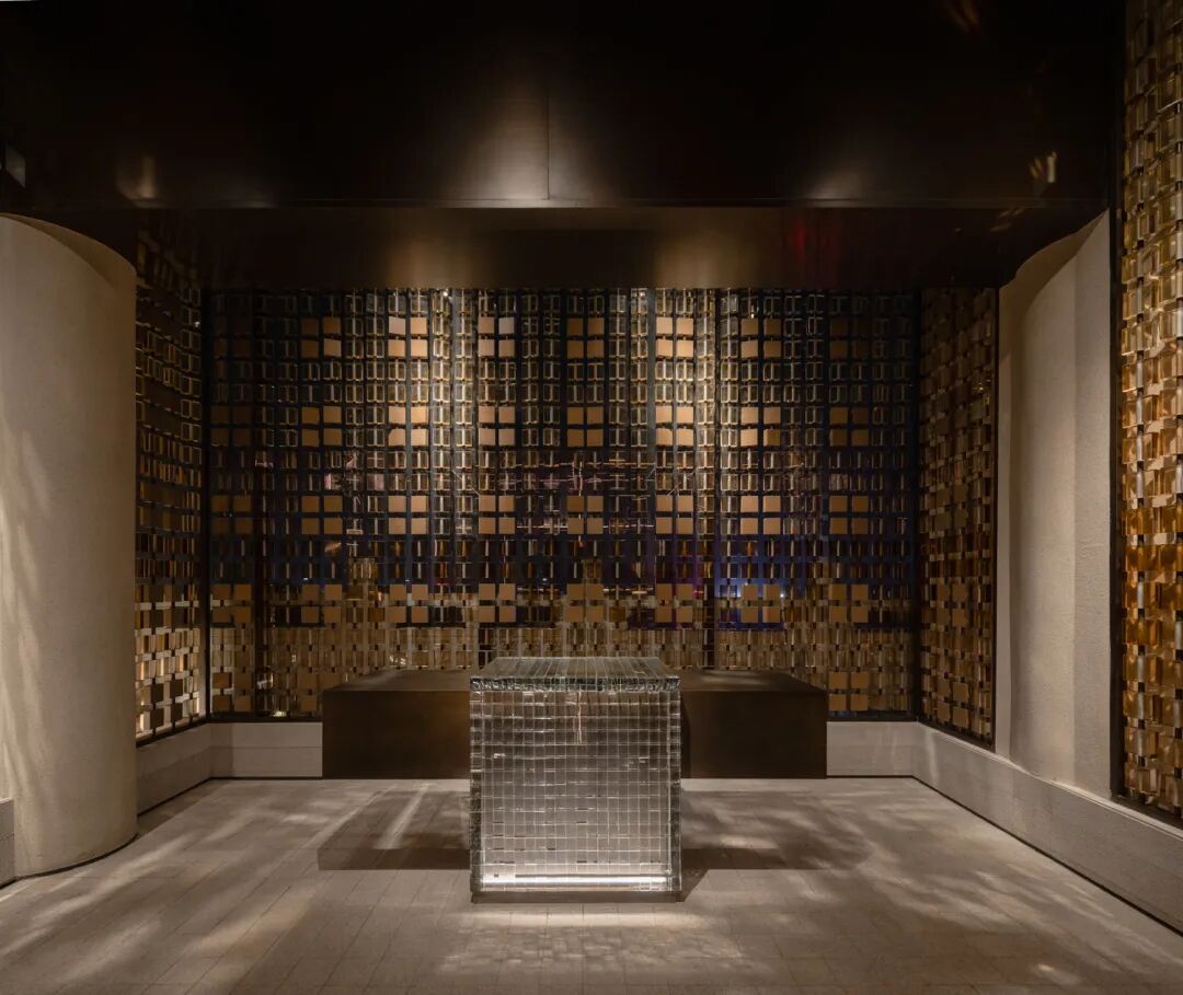 设计师延伸了对西安城墙外观的青砖基座想象,重新使用不同的材料和安装方式来呈现该层的方形视觉。在进门后,以一处浅色实木方砖及三种颜色玻璃砖深 「橘、橘、黄」为渐变组合的垂立装置,划分了室内外的区域。吧台以灰砖为立饰面,背墙以陶土砖墙拼贴,同时透过不规则安排将深咖色金属板嵌入部分砖面作为咖啡豆的展示架,提供了装饰及功能的象征。另外,由深咖色金属板与钢化透明玻璃板所制作的大型方格三座储存架,除了包覆吧台区域,并且也将楼梯的起点同时的隐藏起来。“方形”辅助了划分的视觉,相应提供了顾客在区域内活动的隐私条件。