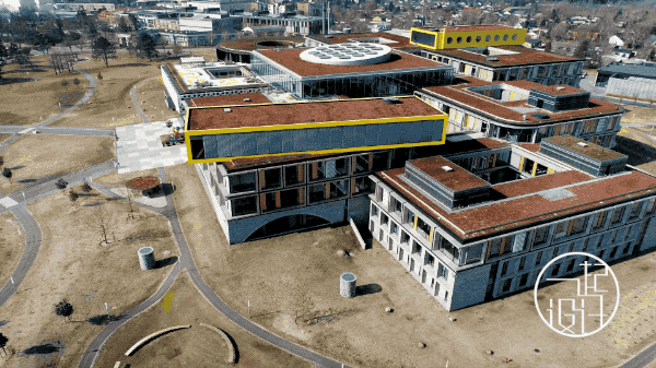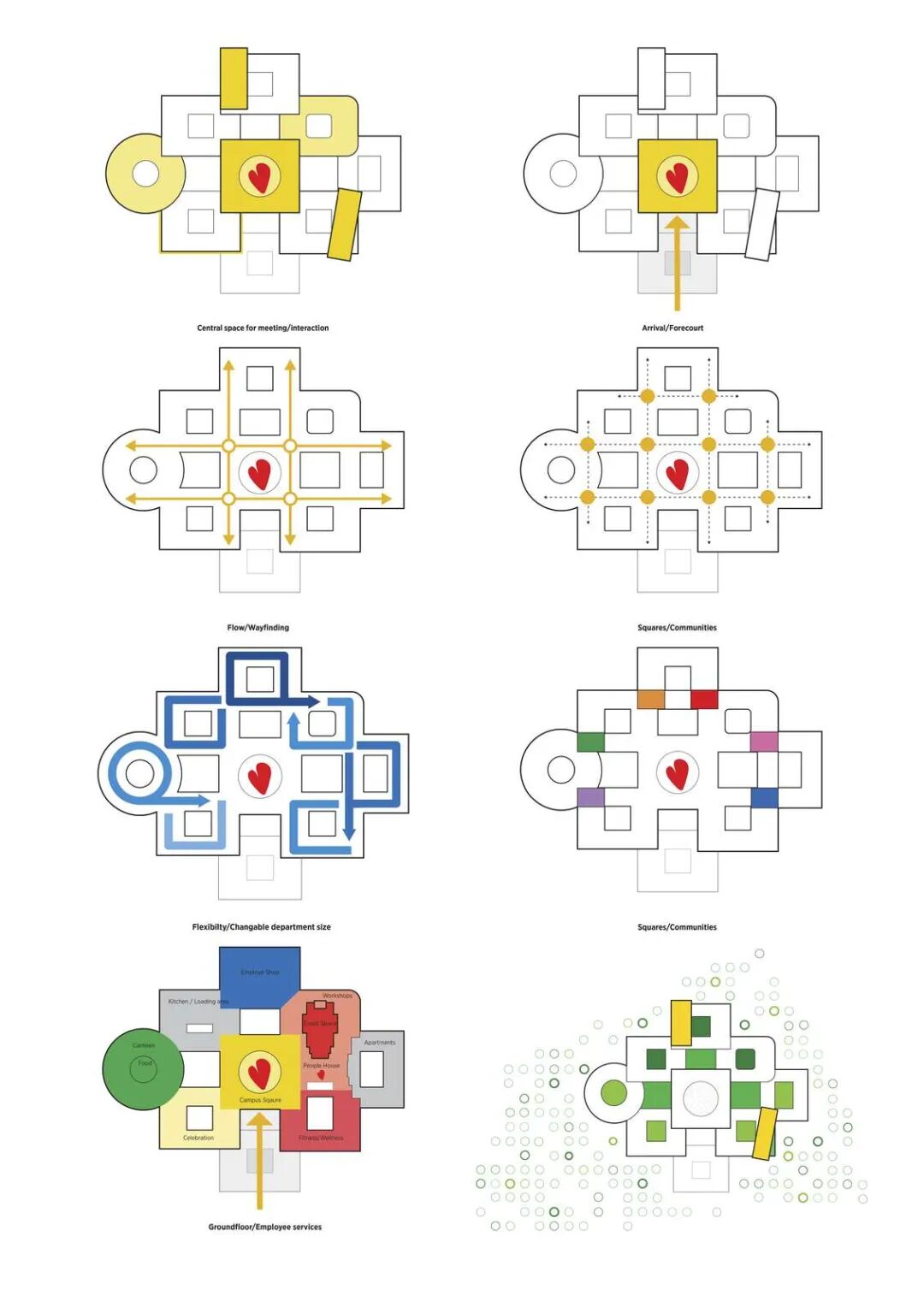 室内围绕着一个壮观的四层楼高的中庭,整个空间被天窗所照亮。在手稿中,中庭是一个充满乐趣的空间,被称作为「Campus Square」,校园广场。