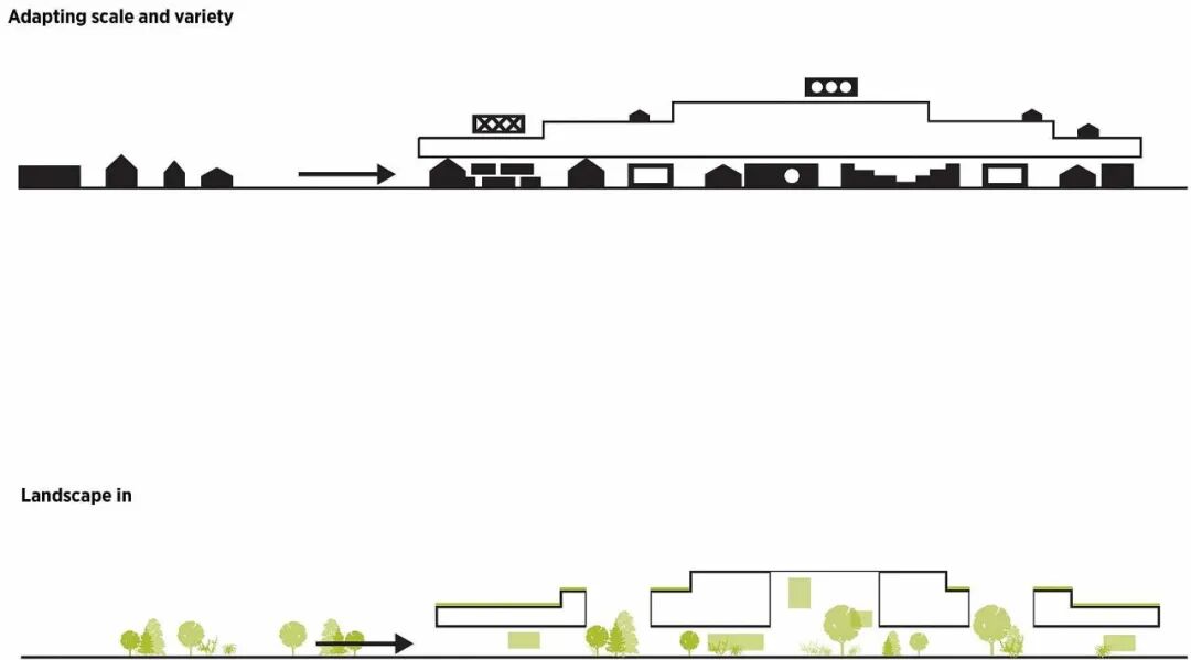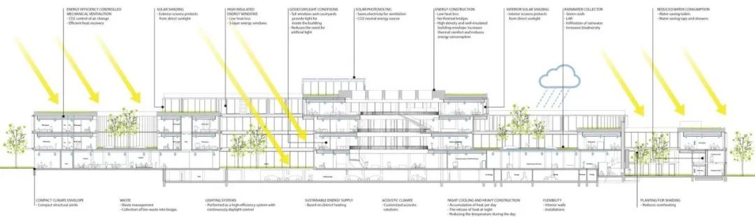 立面的设计既能最大程度的利用自然光来作为室内采光,又能通过通风的条件,最大程度保证建筑整体降温的需求,在屋顶甚至还可以收集雨水,用来灌溉周围的绿地。