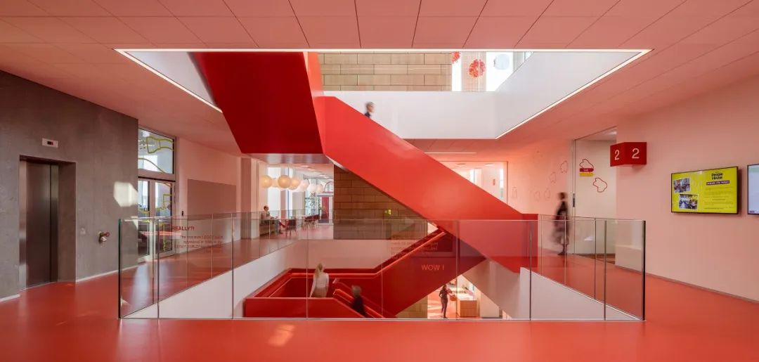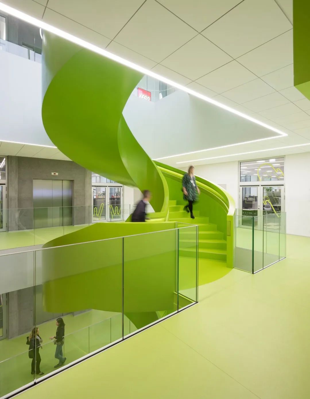 颜色被很好地利用在了不同的楼梯上,这些楼梯连接建筑物的各个部分,并且据此以区分出不同空间,可以让人更好地「认路」。
