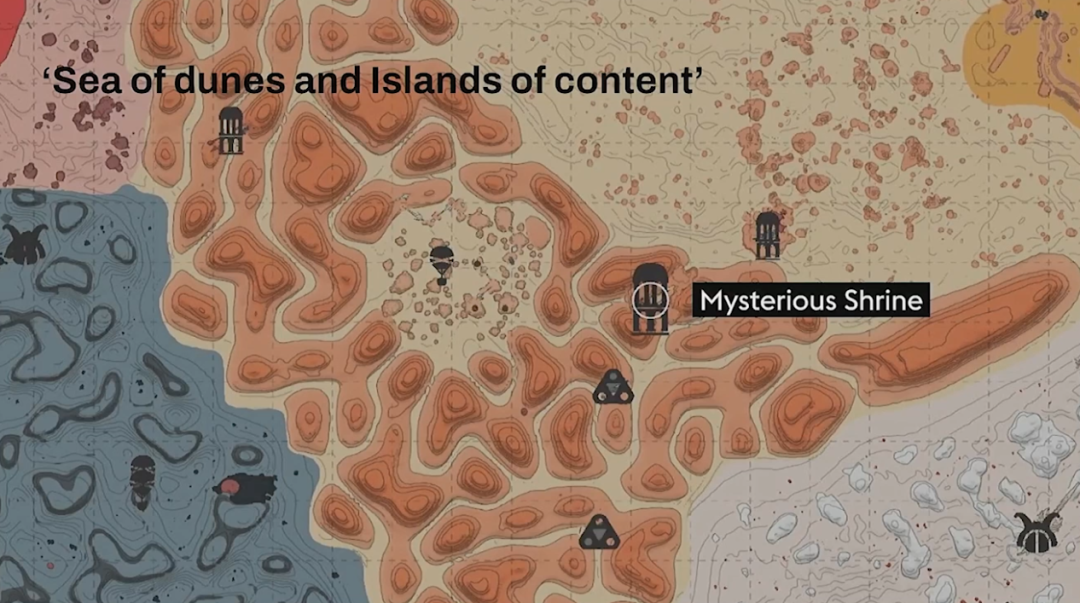 此外,Kythreotis强调,游戏中的沙丘本身就是十分重要的视觉和设计语言,它将环境进行了自然的模糊化,各种事物在视野中不断消失又不断出现,富含强烈的神秘感和吸引力,促使玩家始终沉浸在探索、发现甚至迷路的过程中,成为《Sable》世界构建的重要部分。