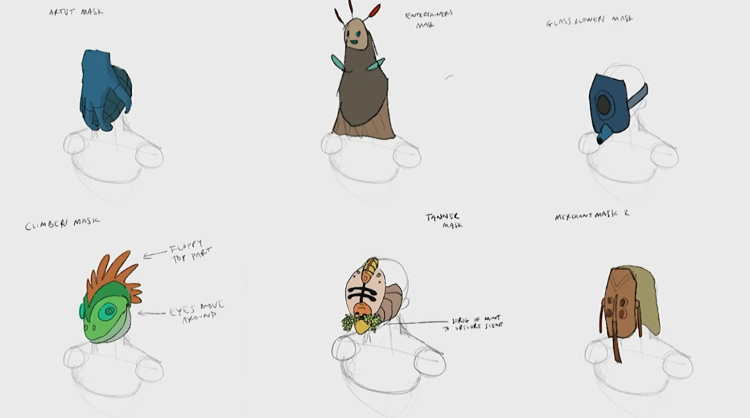 Kythreotis提到,早期团队缺少动画师使得他们在制作面部动画方面受限,因此引入了面具的设计,并逐渐成为了游戏的叙事和艺术焦点。这些面具没有具体的文化或历史来源,而是更专注于符号象征、交流和功能性意义。