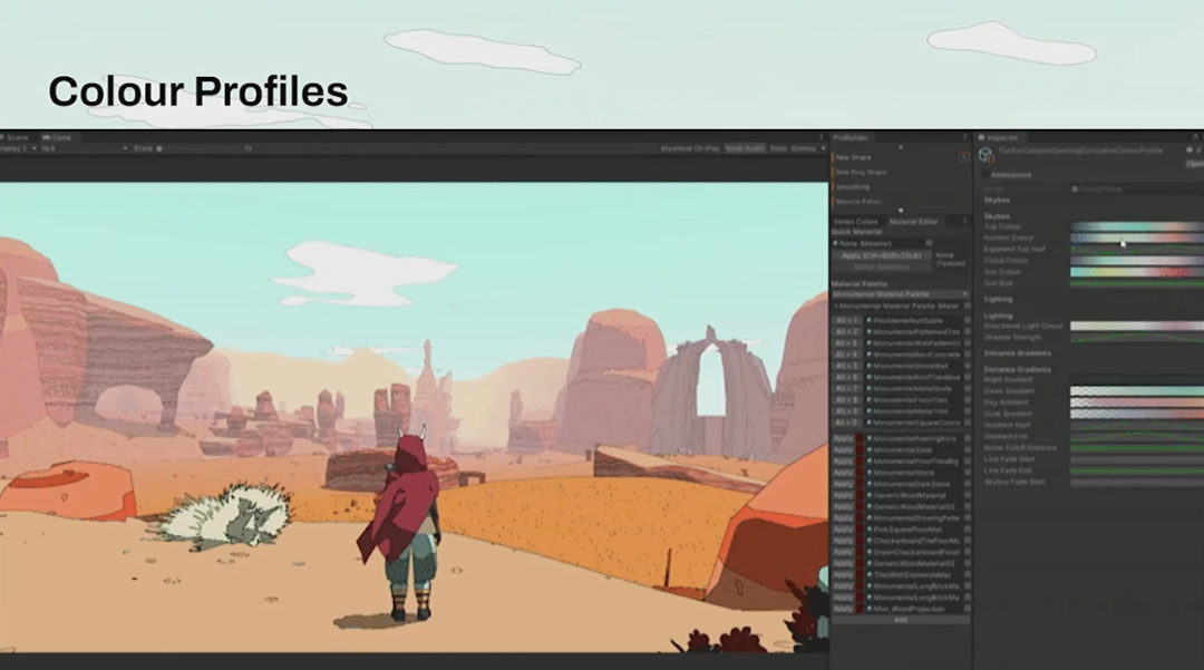 一方面,开发团队使用了被称为色彩调校的工具,来设置不同时间点和生物群落的色彩属性。艺术家也可以上手微调各种梯度变化曲线,或者设置轮廓线出现和消失处的阴影强度等。另一方面,他们也尝试搭配了多种不同的色彩方案,通过颜色之间的转换表达旅行感和时间的流逝感,作为给玩家的探索反馈。
