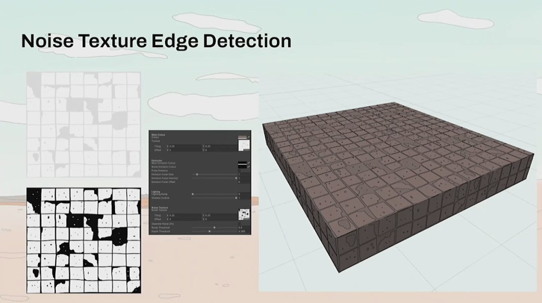 ● 第三种是噪音纹理。使用着色器为纹理贴图创建特定的插槽,通过区分纹理的色彩部分和噪音部分,可以组合创造出各种不同的样式。