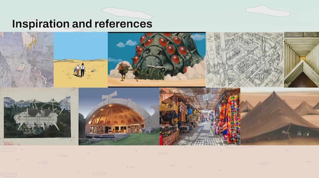在最为人称道的艺术方面,《Sable》开发者们基于团队的兴趣和能力考量,希望将3D的游戏环境打造成2D风格,并且给人一种手工感,因此参考了很多2D动画和插图,如Moebius、Herge和Schuiten的作品。团队也调研了各种乡土建筑和帐篷建筑,以积累灵感。