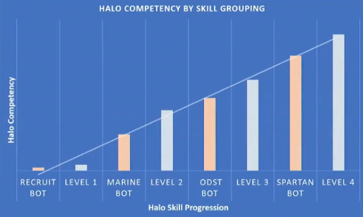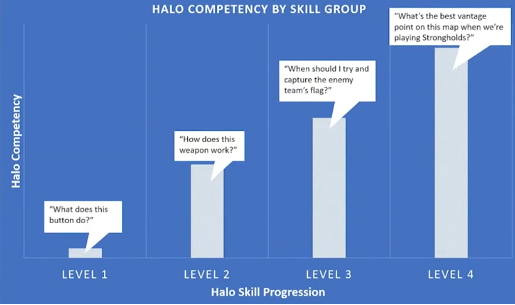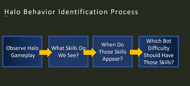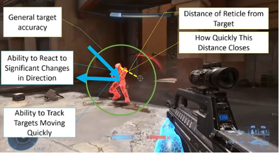 《光环:无限》的开发团队提出,“《光环》中的战斗行为是一种动态的参与节奏,是反应式的、脑力式的舞蹈,感觉像是交响乐”,演讲者延续该理念,认为玩家的战斗行为可以分成:扫射、瞄准、投掷手榴弹、近战,以及掌握继续战斗或逃离的时间五种技能,不同水平的玩家在操作这五种技能时会表现出不同的行为模式。