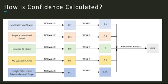 下图是机器人信心计算的公式,将对手的护盾状态,自身的护盾状态,目标距离,自身武器状态以及与对手之间的距离差,五个数值进行归一化,并赋予这些值不同的权重,最后加和得到的值再归一化,输出0-1范围内的自信心数值,以此作为选择逃跑还是继续战斗的依据。