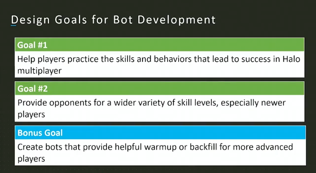《光环:无限》的一大亮点是在游戏中加入了多人模式,并在该模式中首次加入AI机器人。机器人在帮助玩家快速匹配,训练新手快速上手,制造温暖局方面发挥着相当重要的作用,因此如何对机器人进行设计就变得十分关键。