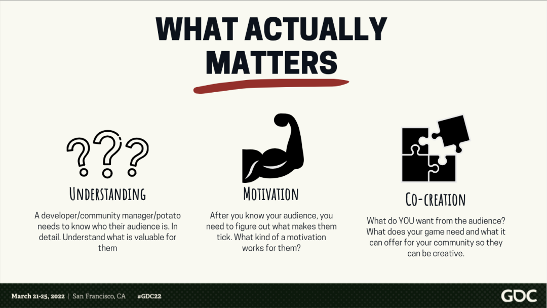 ● 理解目标玩家:开发者/社区经理应该去详细了解哪些人是他们的目标玩家,并且去了解什么才是对这些目标玩家最重要的东西;