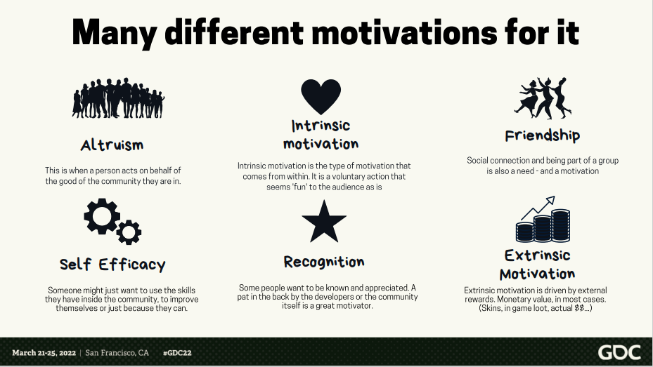 在此过程中开发团队能够促进玩家之间共同目标的达成,从而推动玩家社群的发展。大多数玩家在游戏中原本就在寻找其与游戏的共同价值,而能在社群中参与共同创作,对玩家来说则是额外的鼓励。