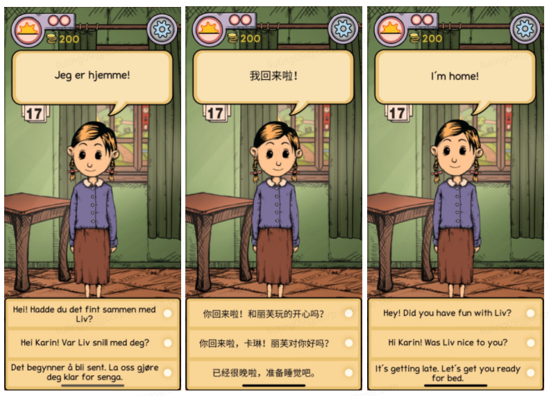 图:《我的孩子:希望之泉》挪威语、中文、英文游戏界面