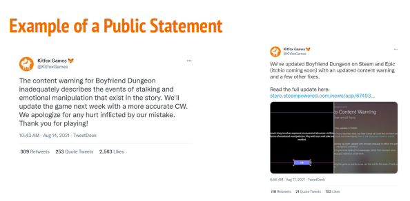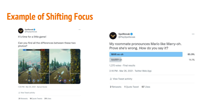 案例:左侧这张图片展示的是演讲者运营的《Spellbreak》更新新章节时的一个互动。当时的情况是,她们并不能对游戏将要更新的内容进行一些说明或者介绍,所以发布了两张图片,一张是当前游戏里某个内容的展示,另一张是该内容即将更新的展示,然后让玩家去找不同。这种方式让她们在无法提前进行说明的情况下安抚了那些呼吁更新的玩家,同时也让玩家积极地参与到更新内容的讨论中来。