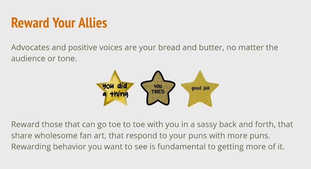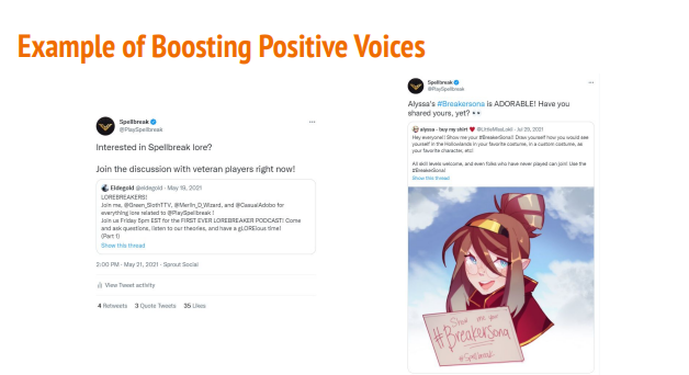 最后是“Spellbreak”,这是演讲者协助管理的一个账号。它的人设是充满活力、充满热情的。比如,在社区运营中,她们总会用“We’re excited to......”这样的句式去表达。