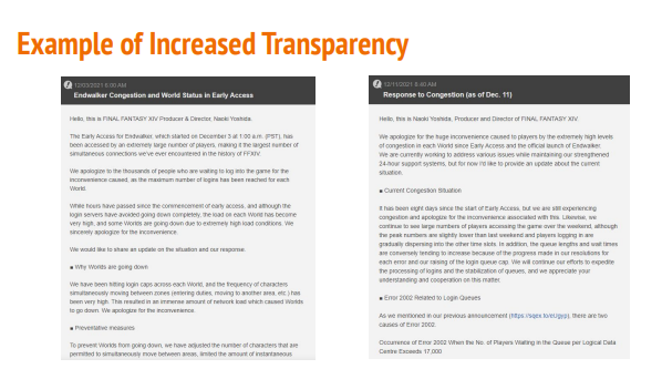 案例:去年12月,《最终幻想14》更新了《晓月之终途》资料片,这可能是迄今为止最受玩家欢迎的更新。由于玩家热度太高,服务器发生崩溃,玩家不断被踢出游戏,并且无法登录。这个事情产生了非常负面的影响。当时他们是怎么处理这次负面舆论危机的呢?