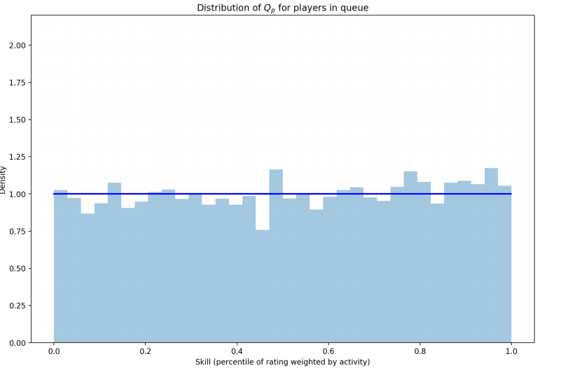 作者最后选择了加权经验累计分布函数(weighted empirical cumulative distribution function, 简称WECDF) 作为划分玩家区间的方法,对于一个评分小于玩家P的玩家比例,按其出场次数加权。以玩家在排队序列中的分布可以看出,每个区间玩家的数量是均匀的,因此保证了匹配的统一(Uniformity)。