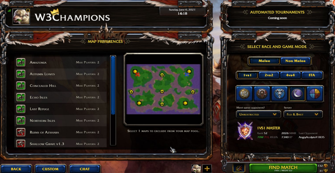 进入游戏后,你可以点击W3Champions的按钮,选择游戏的模式如(1on1),你希望使用的种族,然后点击FIND MATCH按钮就可以自动寻找匹配的对局,并开始游戏。最终,游戏的结果会自动发送到数据库。这意味着,玩家不需要做除了玩游戏之外其它额外的工作,如记录游戏结果。