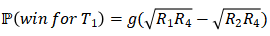 整个公式的值跟p的大小有关,可以看出当p=1时,就是求玩家的积分均值。为了获得一个更好的p值,作者通过对游戏的对战历史做极大似然估计,最终得出p=-0.02时,用于2v2匹配是最合适的。那么获胜的概率可以表示为: