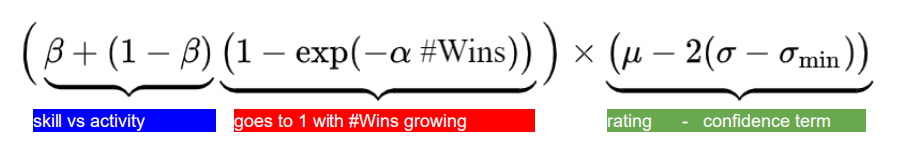 其中,参数用来权衡玩家的技能水平与活跃度,参数是用来衡量“足够“多对局的标准。可以看出,当玩家获胜场次不断增加时,你可以获得的收益是不断减少的,最终公式的前半部分: