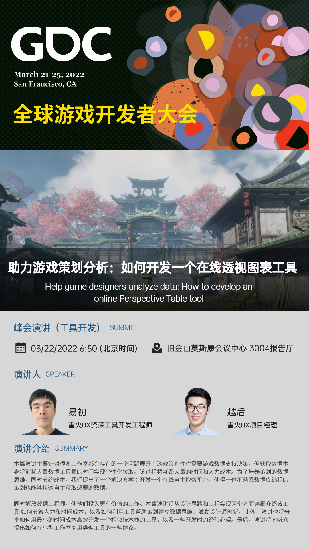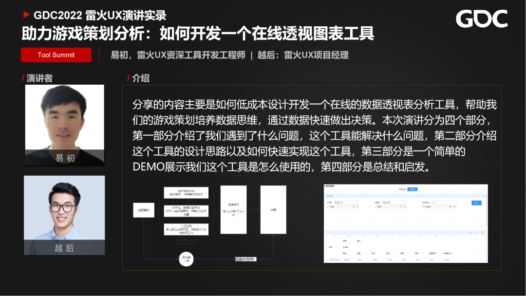 接下来雷火UX公众号将陆续为大家进行介绍。本篇为大家介绍的是来自雷火UX资深工具开发工程师易初&雷火UX项目经理越后的演讲——“助力游戏策划分析:如何开发一个在线透视图表工具”,以下是演讲实录。