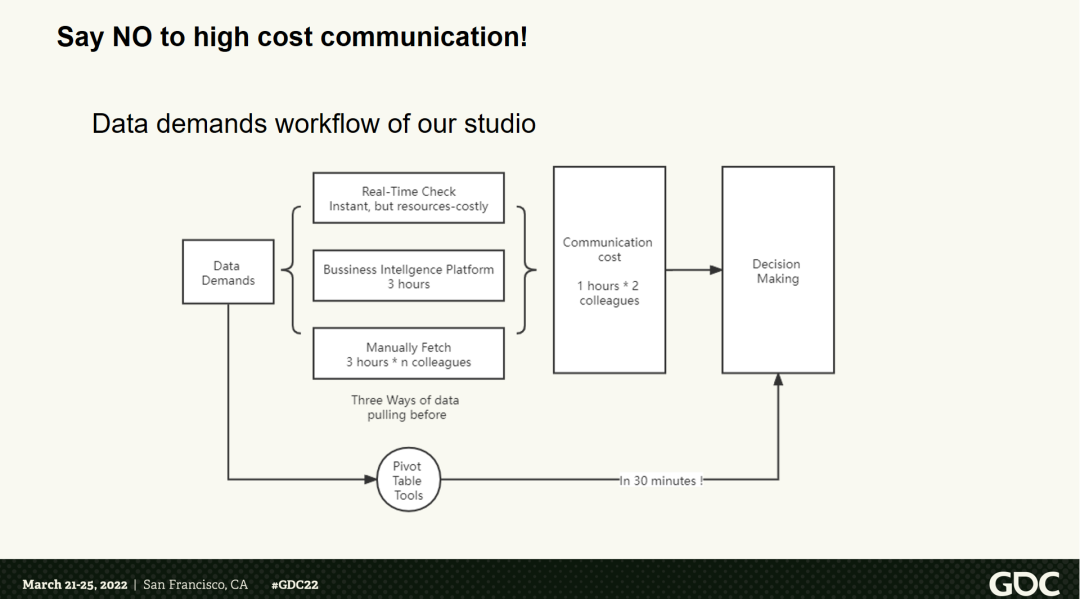 在我们的工作流程中,数据驱动决策对于策划而言已是常规行为。数据是能够最直接客观反馈大规模用户使用习惯的因素。策划往往也会向工程师提出大量数据需求支持决策。但我们的数据工程师需要时间去处理更有价值的工作,频繁的数据需求将耗费团队大量的人力资源处理取数需求。在我们团队,三种传统方式都需要策划、数据产品经理和数据工程师通力合作。都将耗费大量人力成本。